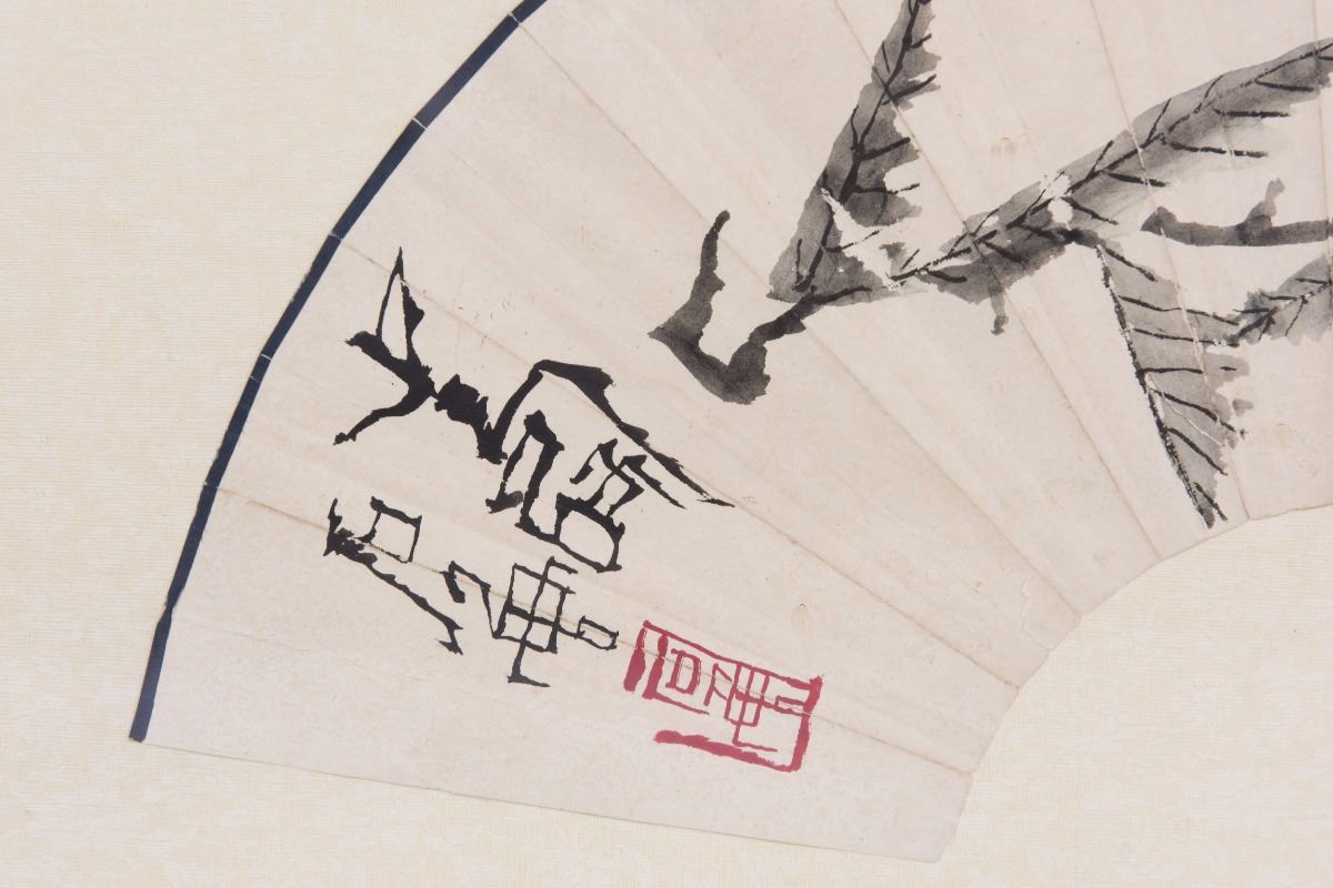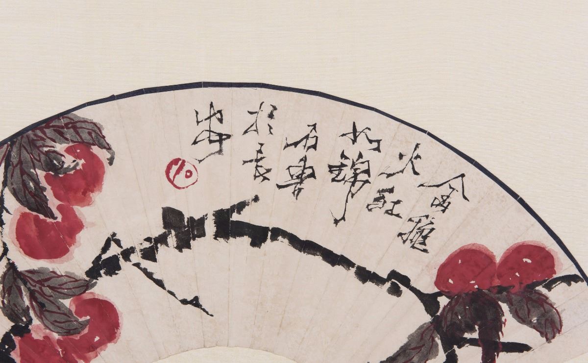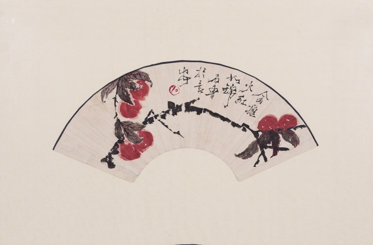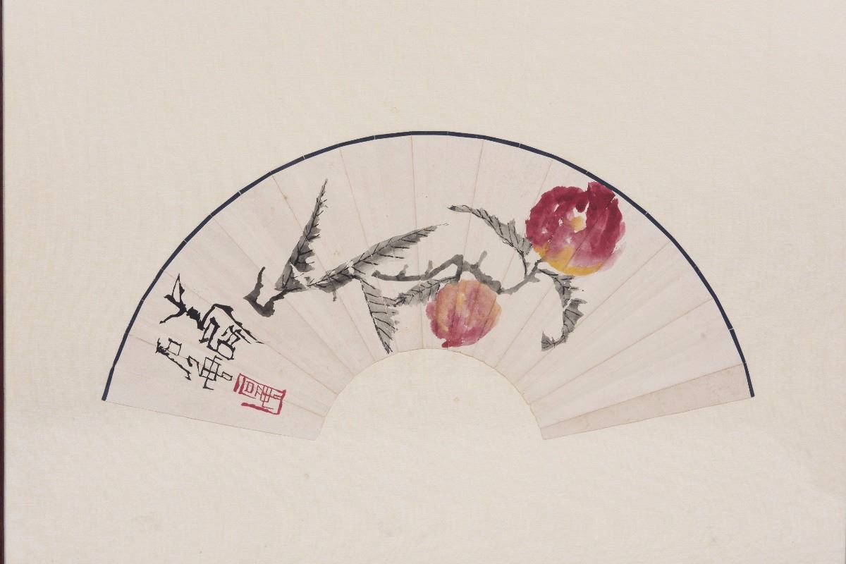 Chinese Fan Painting of red peaches with frame, ink and color on fan paper, each painting signed with Calligraphy signature and one red seal. Length 23" Width 7.75" / Length 21" Width 7."