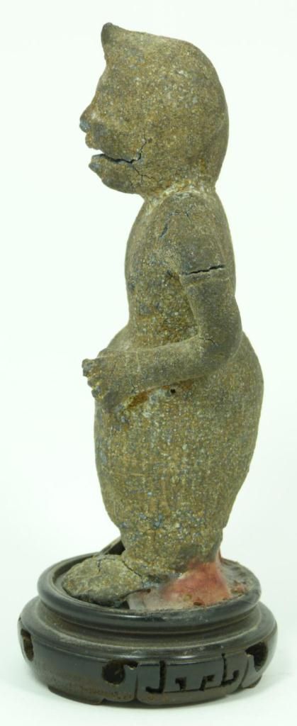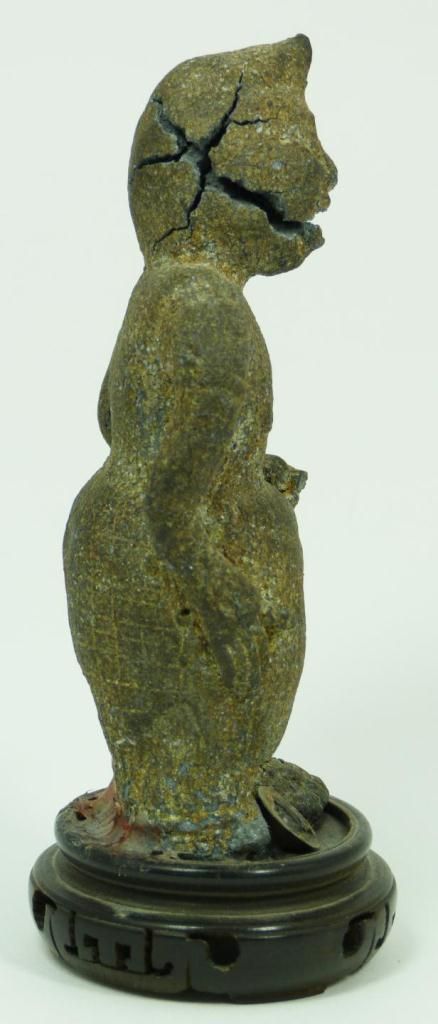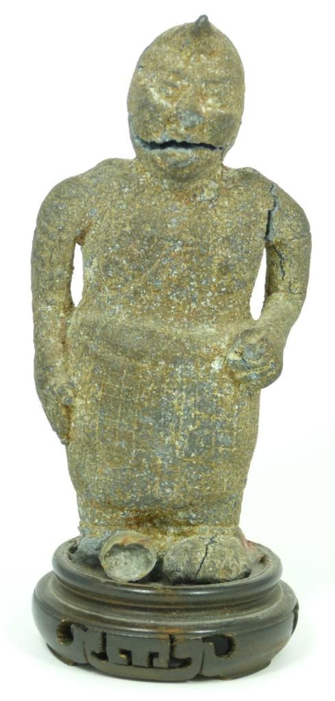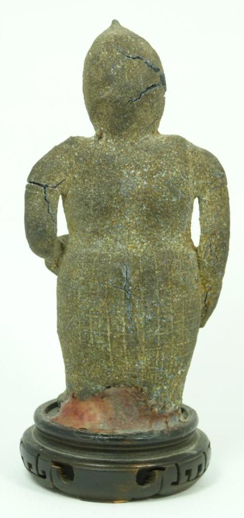 A Chinese Han Dynasty Dian Culture stone warrior figure. Measures 6" height + 7/8" base height (15.2cm + 2.2cm). Total weight of 493 grams.