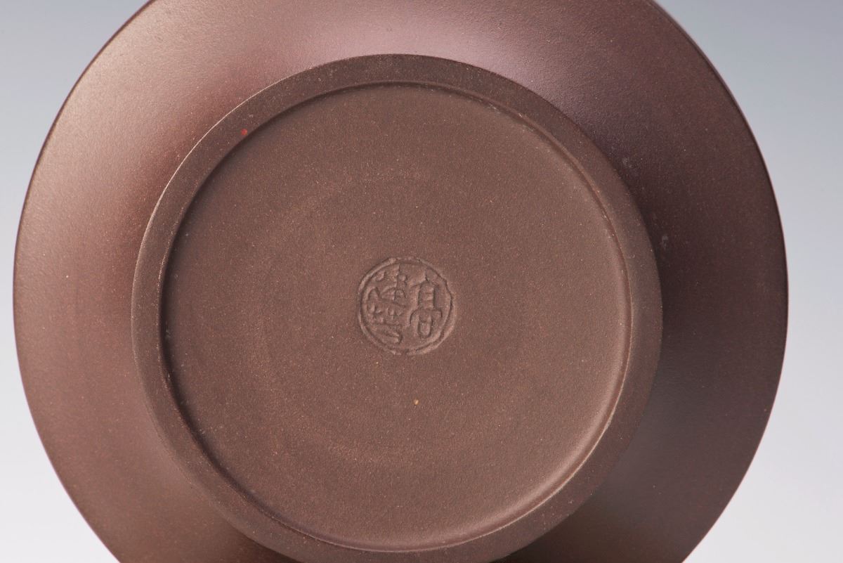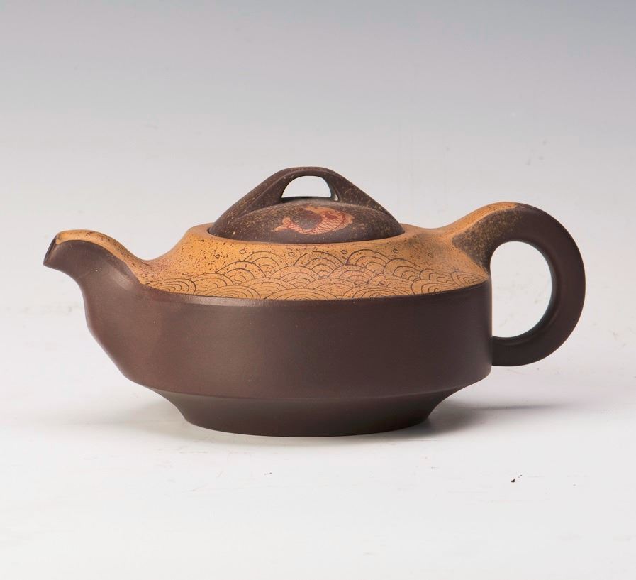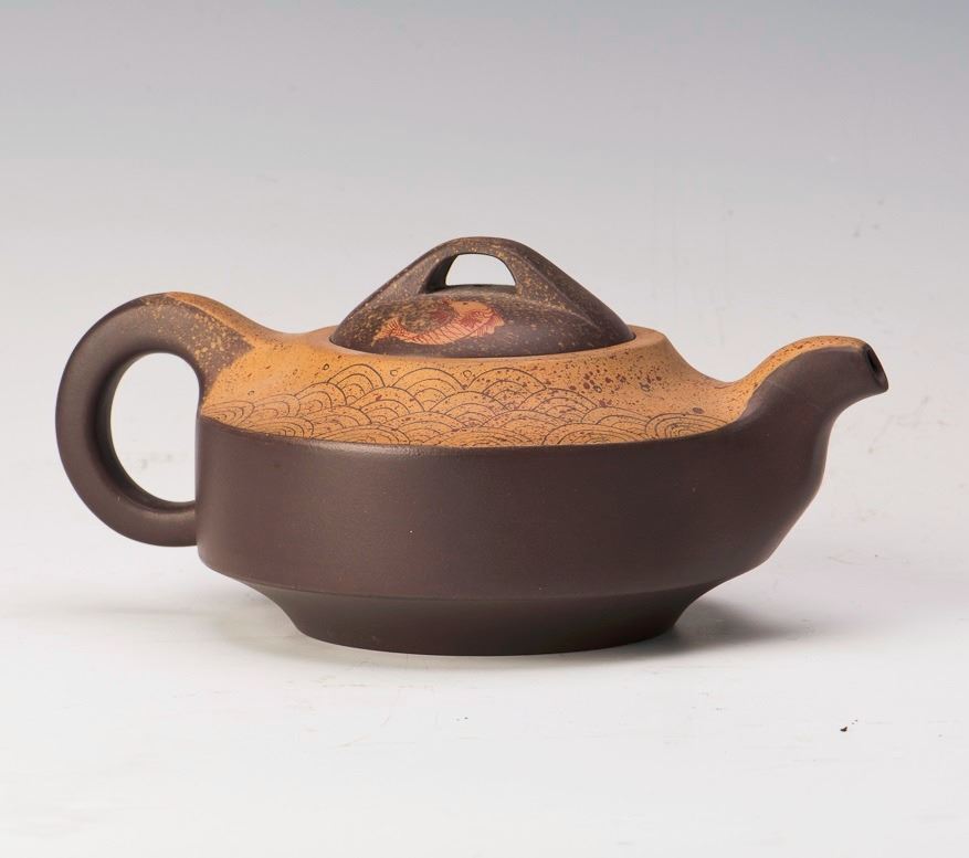 Flat form HANJUN style zisha teapot painted with river ripple on the surface and a vivid fish on the cap, bearing a seal of Gao Jianfang. Length 7" Height 3.25"