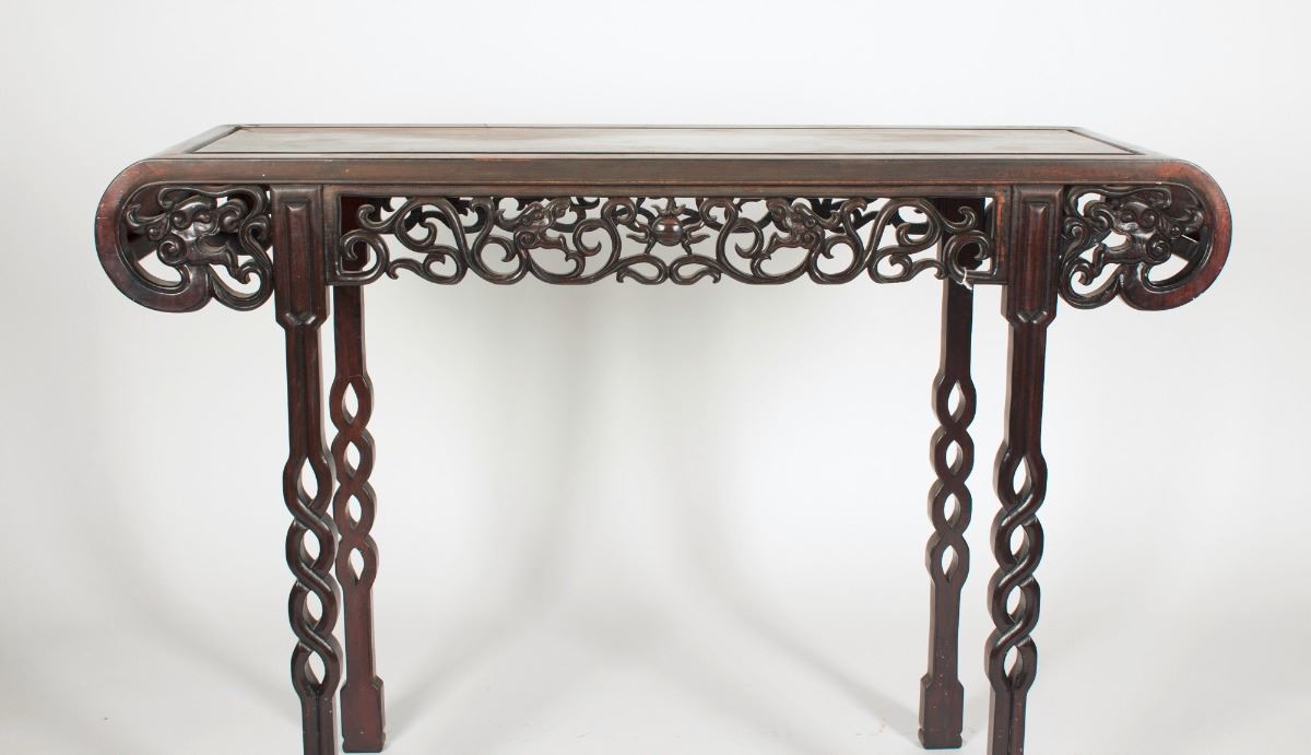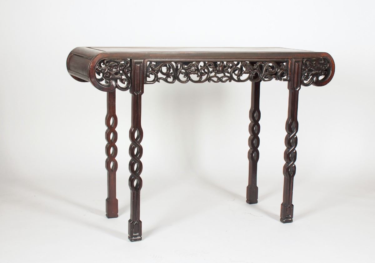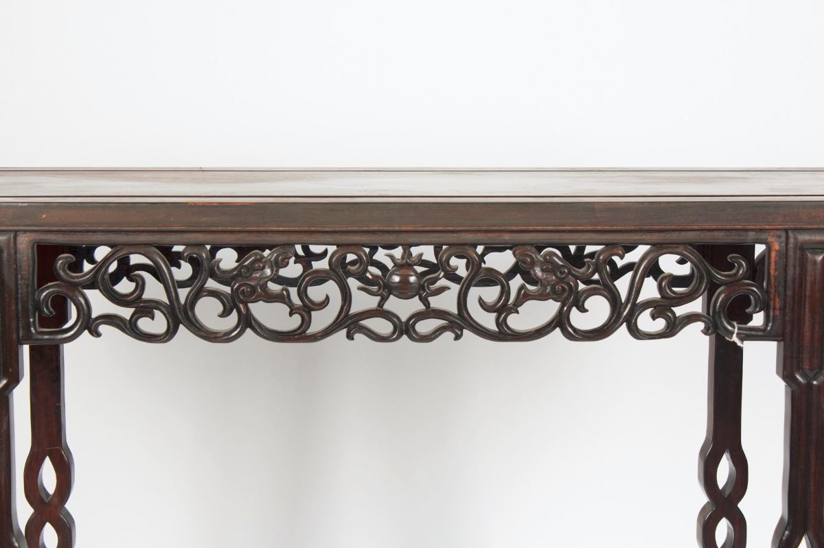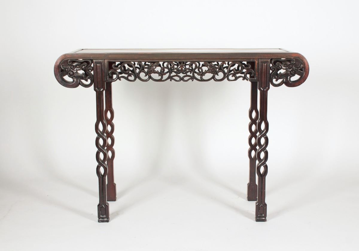 Chinese Hardwood rectangular altar table finely carved with hollowed curve pattern and leg. Length 47.75" Width 16.5" Height 33"