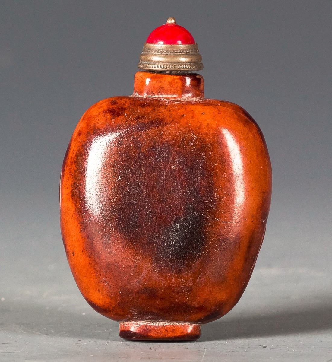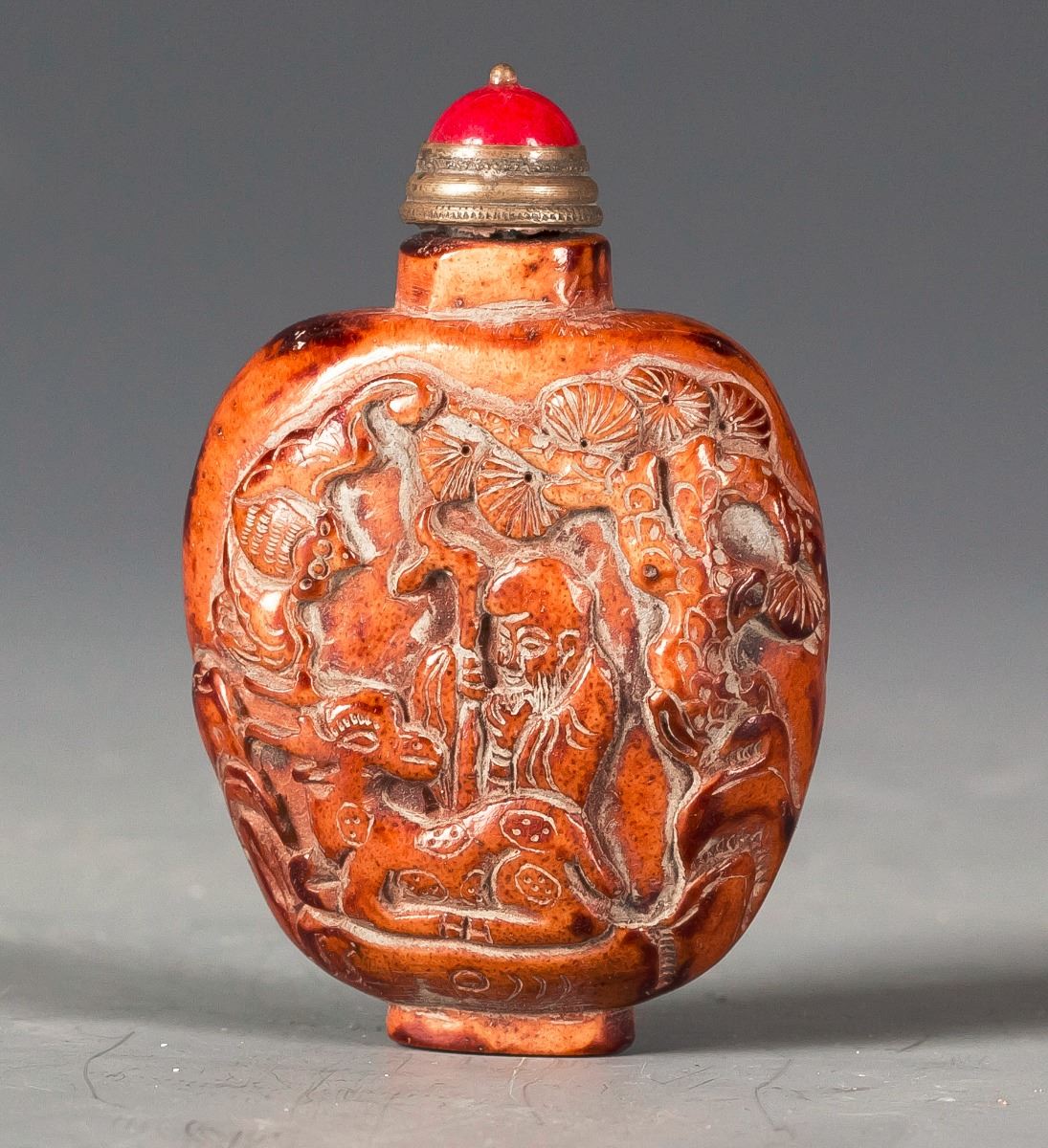 Chinese Horn Carved Snuff Bottle, carved an old man and the deer with red semi-precious stone cap. Length 1.75" Width 0.75 Height 2.5"