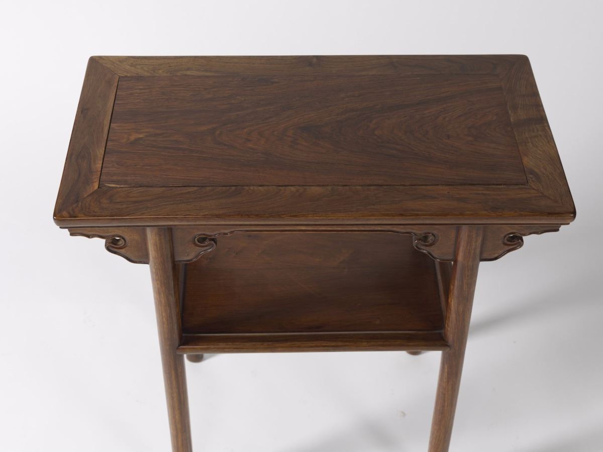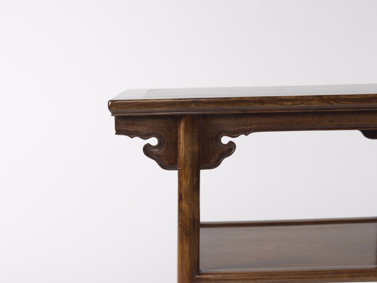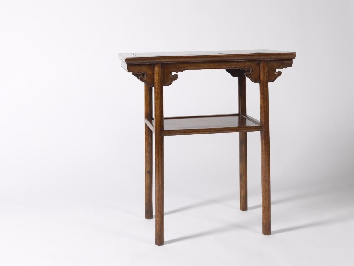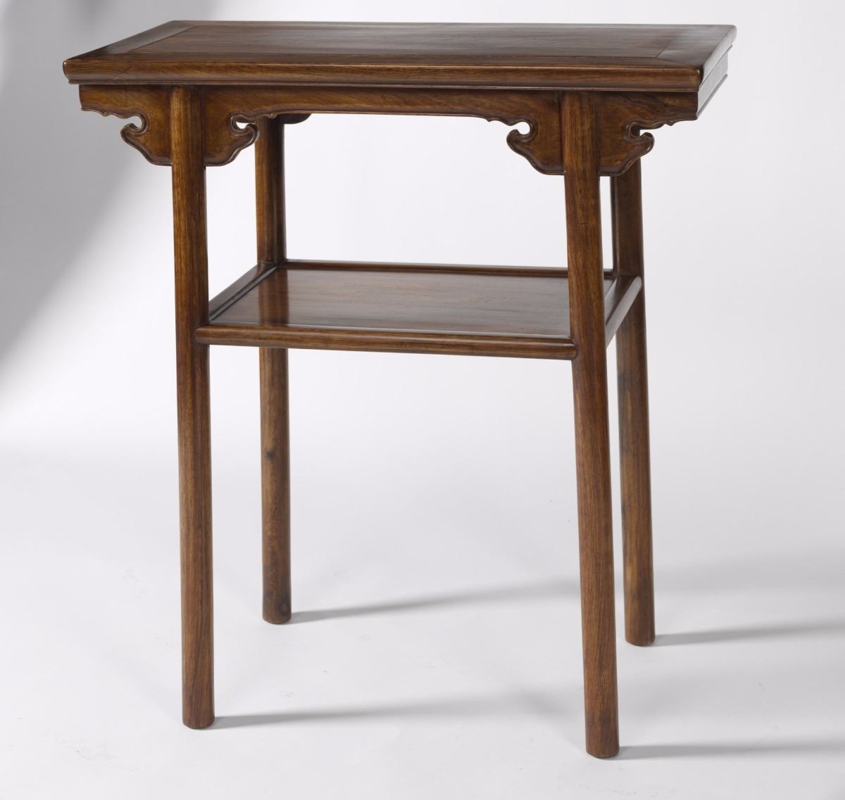 A Chinese Huanghuali Side Table, 19th century. The single panel top set into a mitered, mortise and tenon frame of well figured wood above a beaded apron with shaped ruyi spandrels bisected by tubular legs tenoned to a framed shelf. Length 38.5" Width 14.5" Height 31.75" Provenance Property from the O’Brien Asian Arts collection