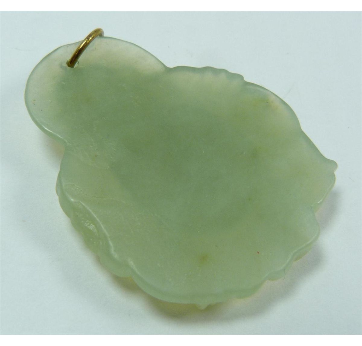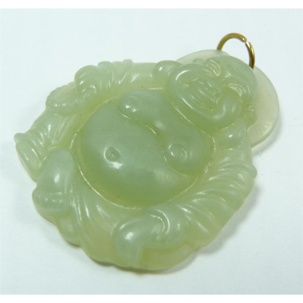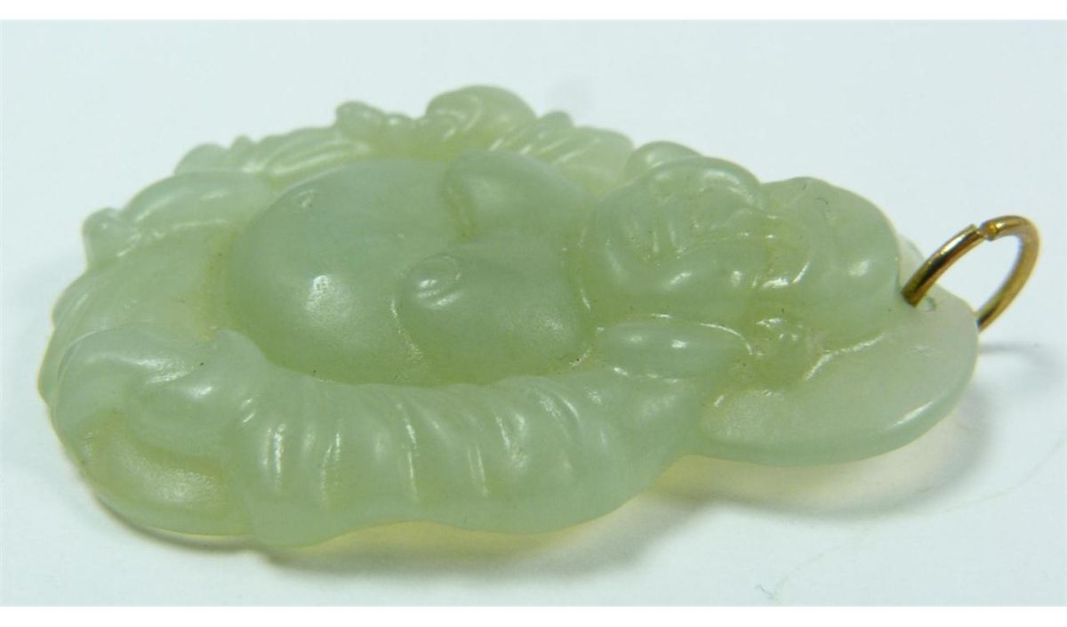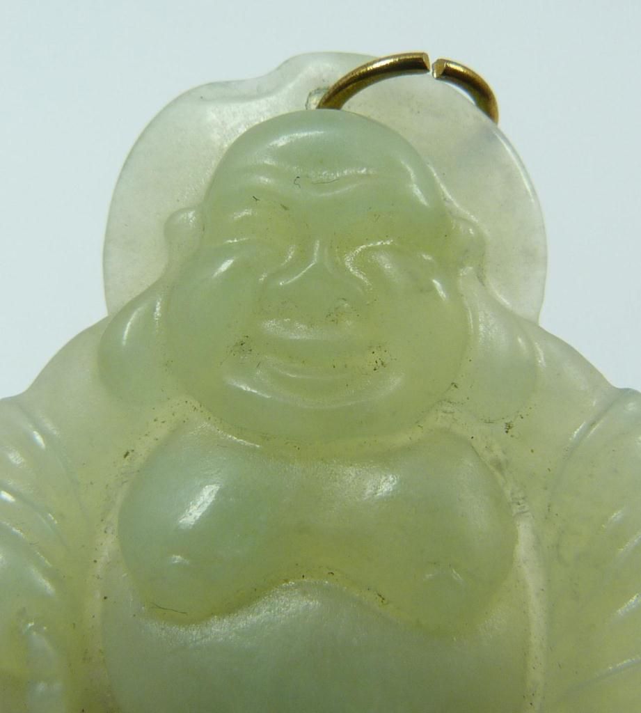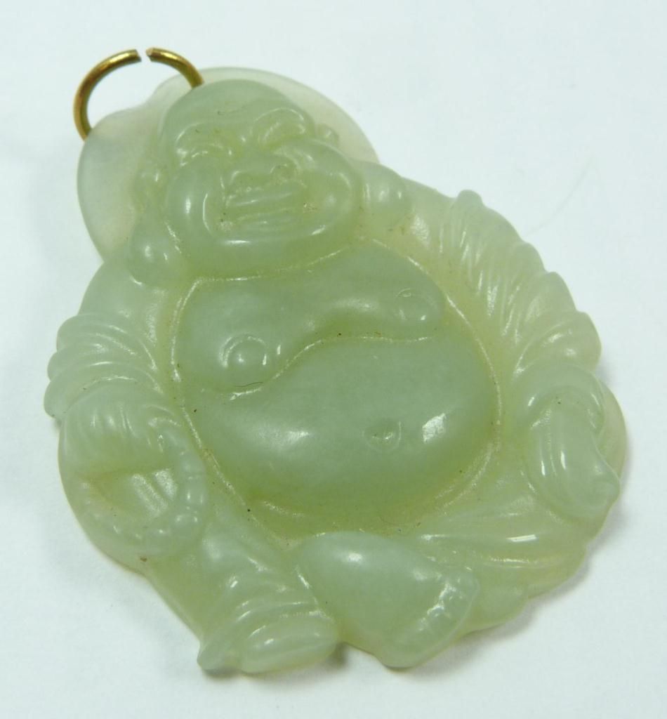 A Chinese carved translucent green jade seated laughing Buddha pendant. Measures 1 3/4" height x 1 3/8" width (4.4cm x 3.5cm). Total weight of 13 grams.