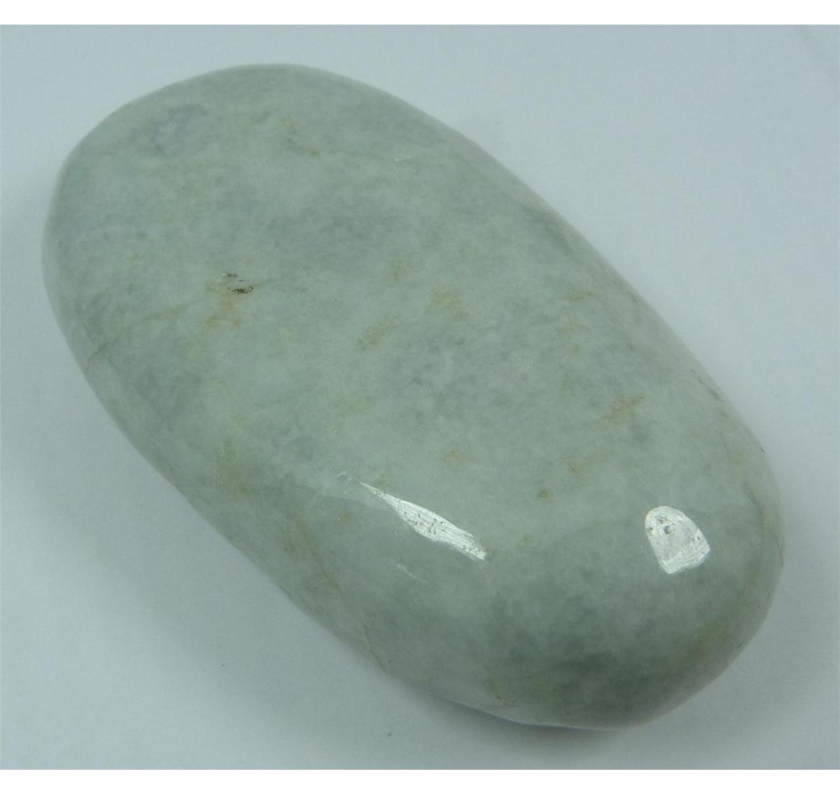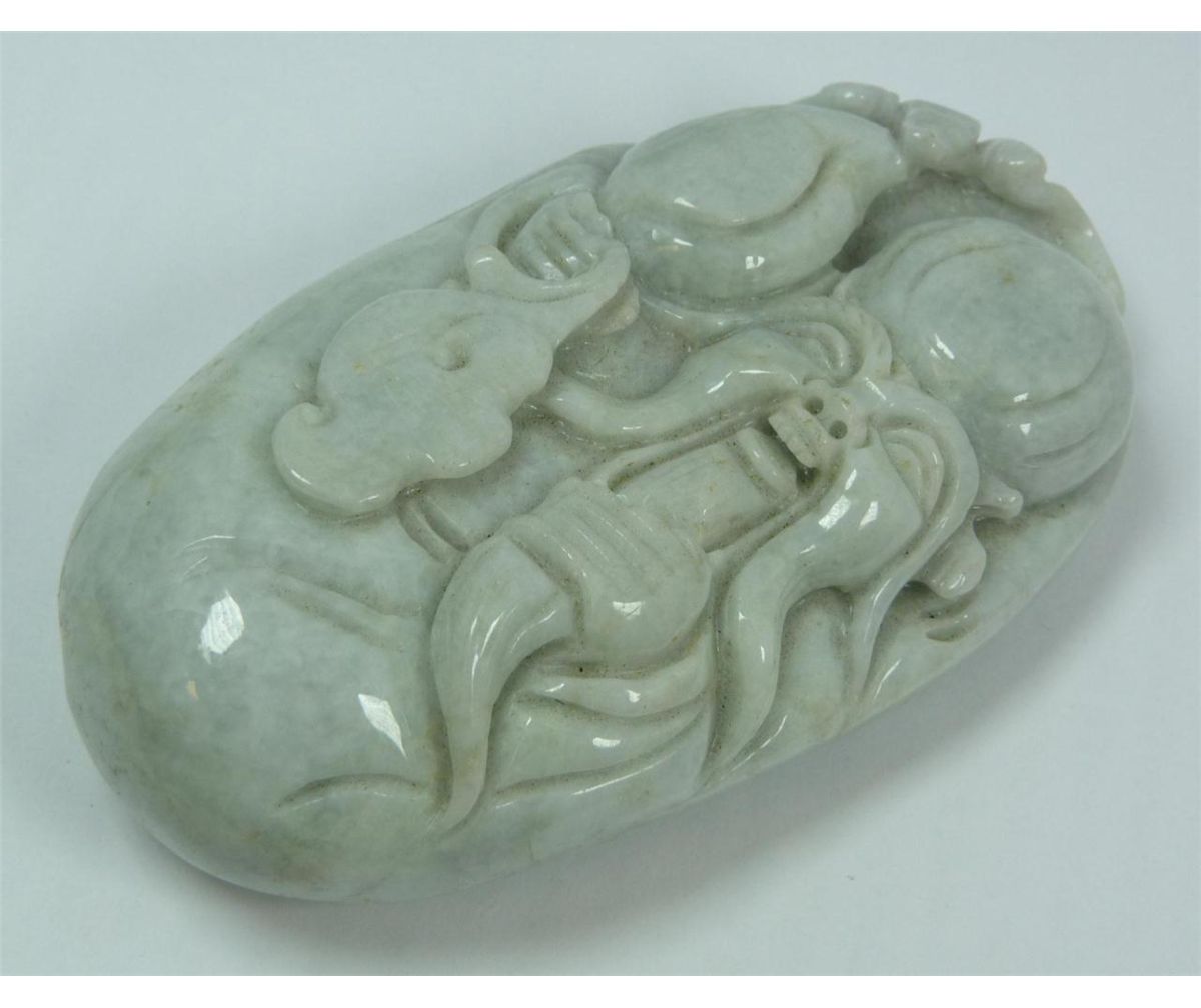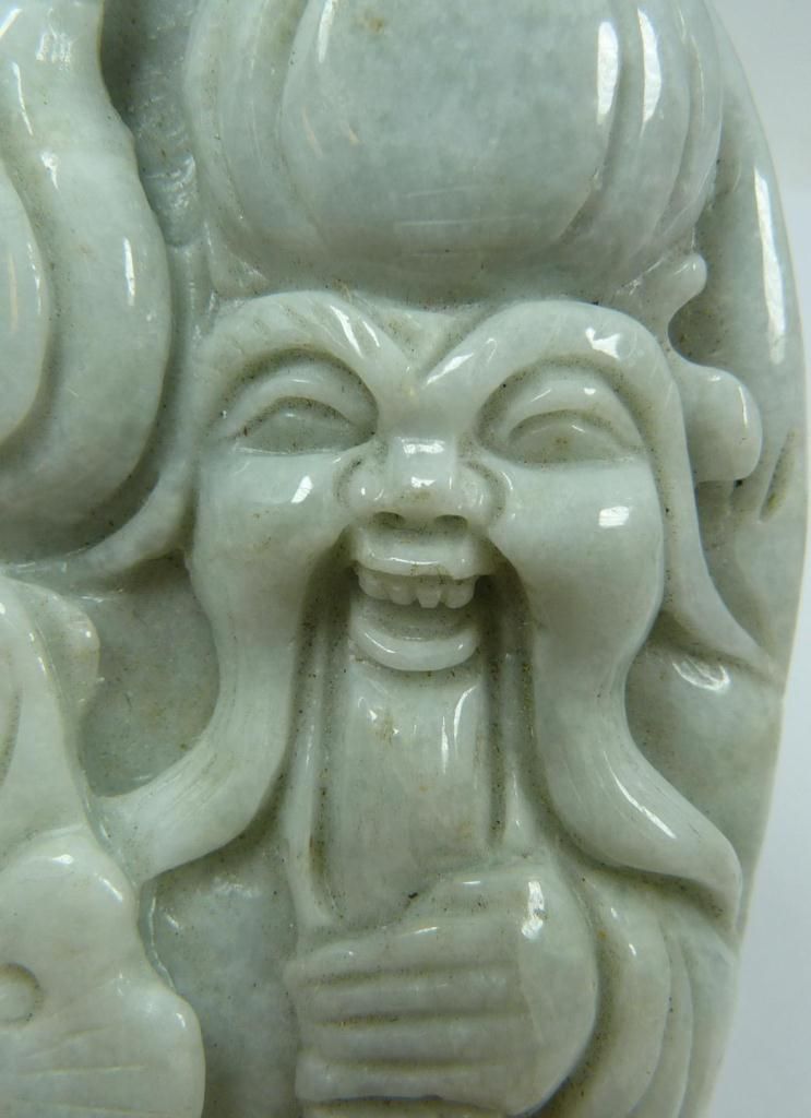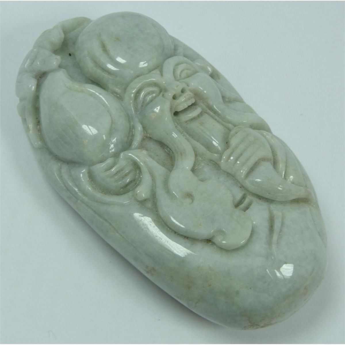 A Chinese jadeite relief carved Shou Xing with peach, lingzhi and bat scholar's desk scroll weight. Measures 3 7/8" length x 2 1/4" width (9.8cm x 5.7cm). Total weight of 288 grams.