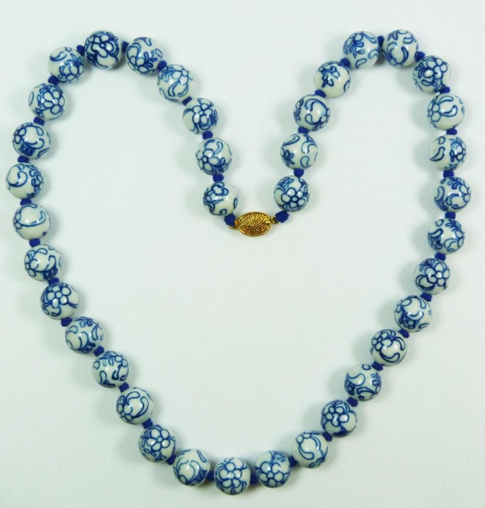 A Chinese hand painted Qing dynasty Kangxi period blue and white porcelain beaded necklace. Holds 37 beads each approx. 14mm. Measures 24" length (60.9cm). Total weight of 111 grams.