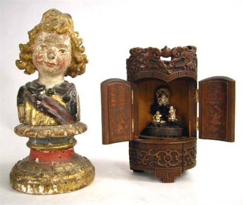 A CHINESE MINIATURE CARVED WOOD ALTAR; Together with a Continental carved bust (losses)