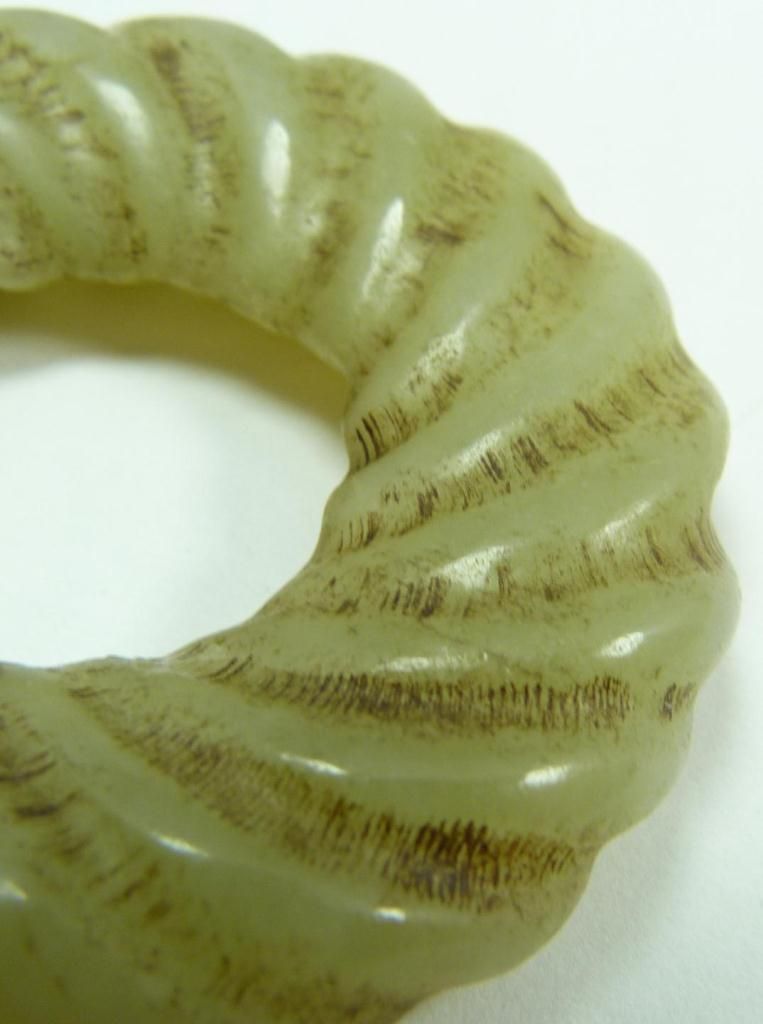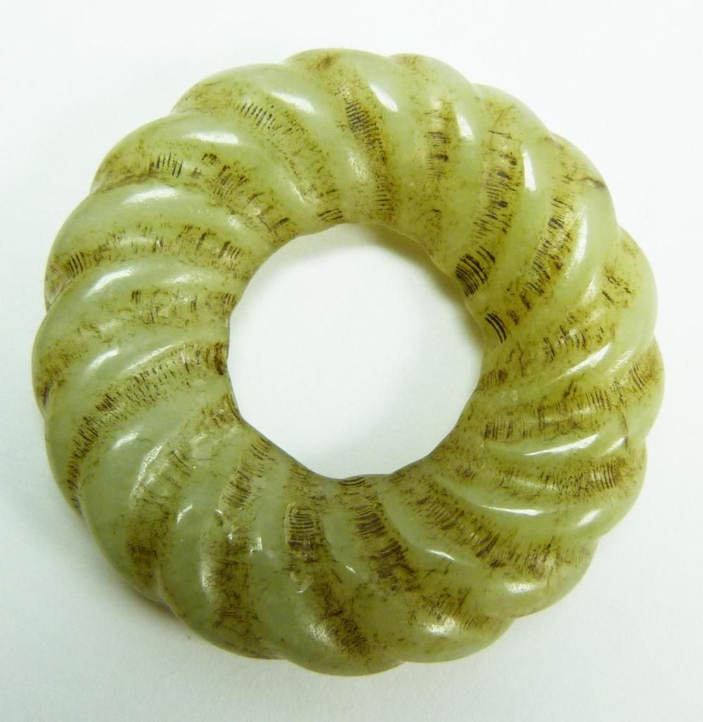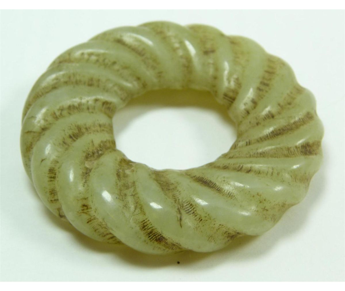 A Chinese nephrite jade circular spiral rope pendant. Measures 2 1/8" diameter (5.4cm). Total weight of 36 grams.