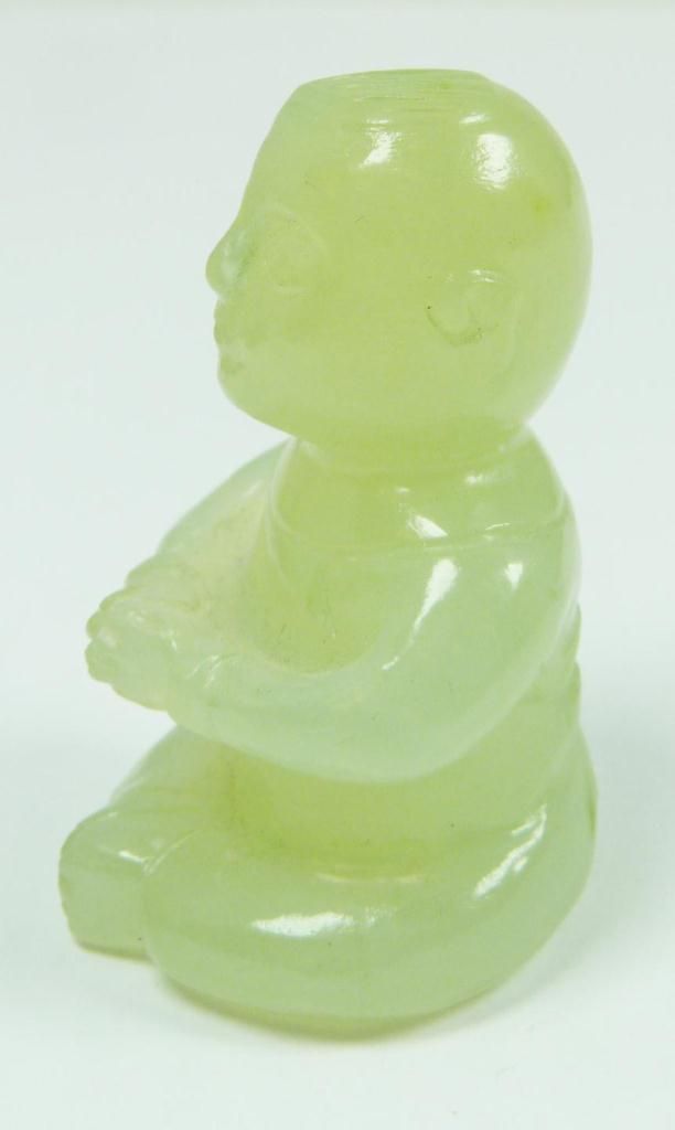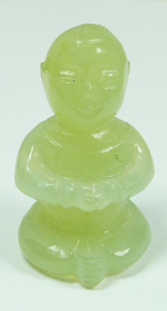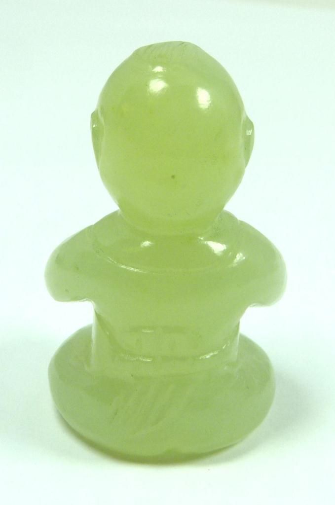 A Chinese nephrite jade seated accolite figure. Translucent even toned green jade color. Measures 2" height (5.1cm). Total weight of 39 grams.