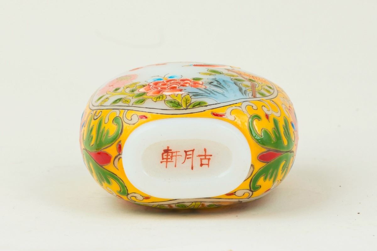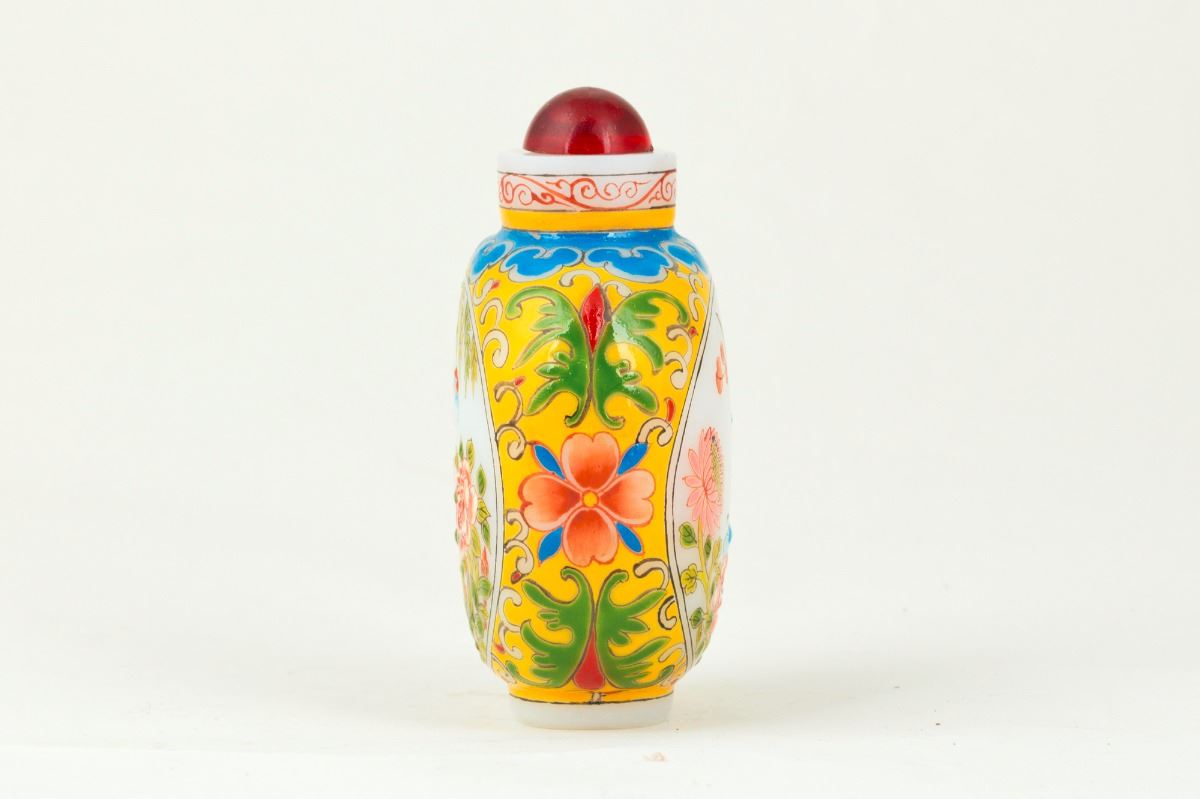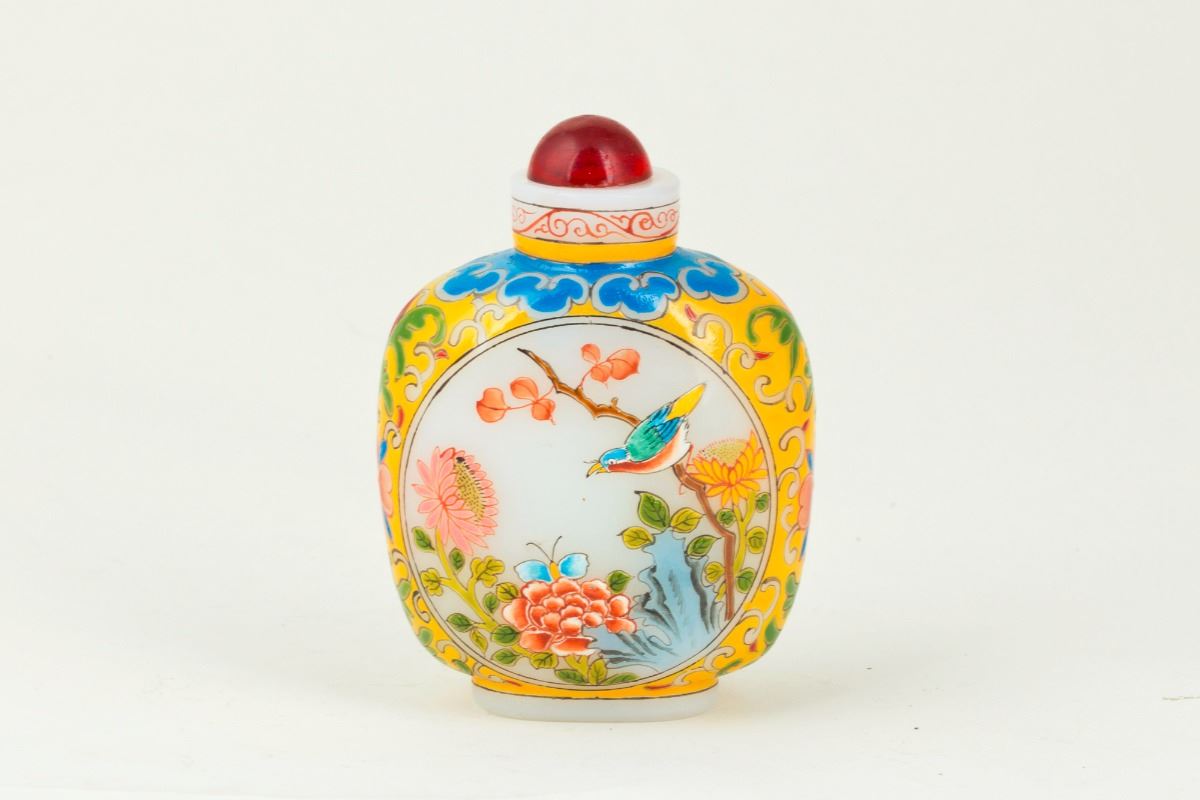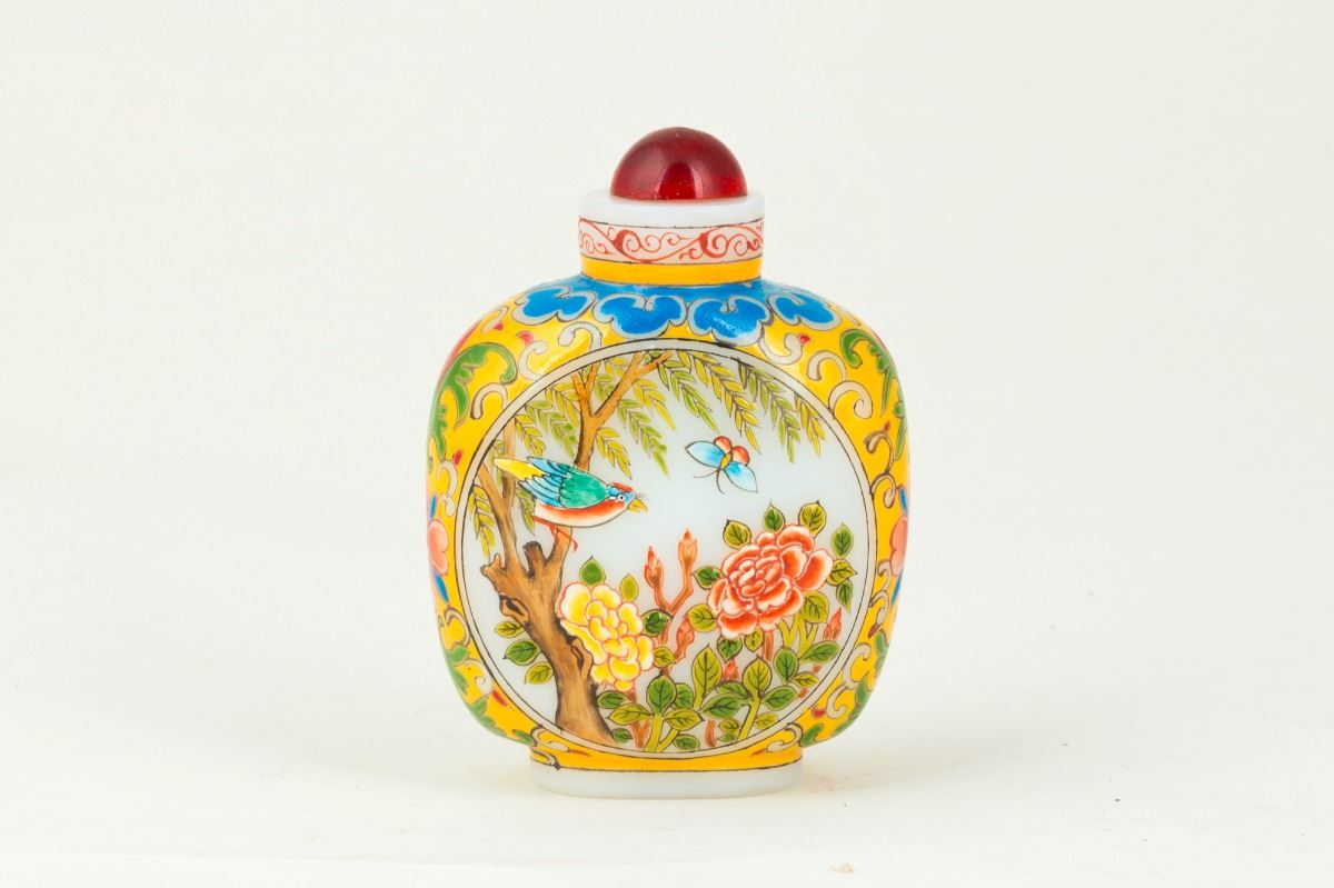 Chinese Bie Jing Glass Snuff Bottle with birds, butterfly, and floral patterns. Capped with red glass knob. Length 2.5" Width 1.5" Height 3.5"