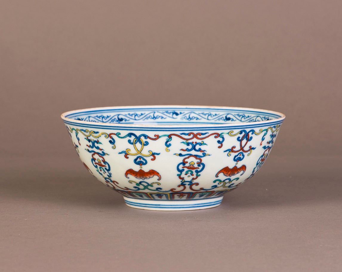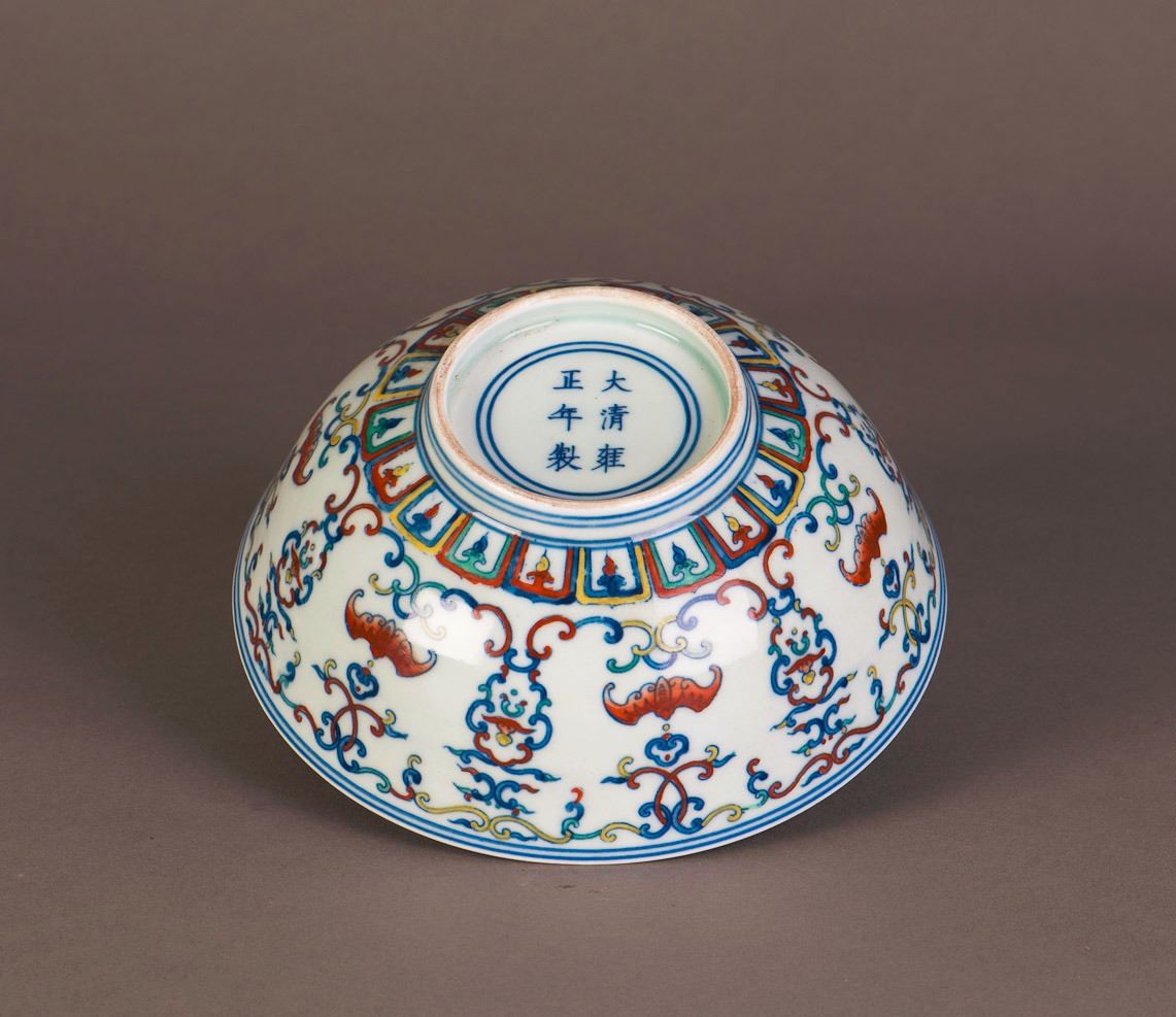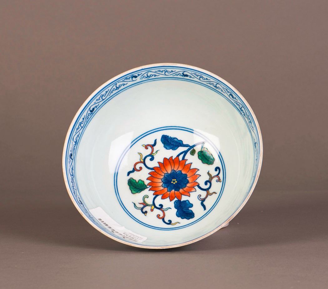 A Chinese porcelain bowl, white ground enamelled with evenly laid-out polychrome auspicious patterns on the exterior, interior highlighted by a flower encircled in double circles and collared by a band of foliate patterns, bearing six-character seal on the base. Height 3.25" Diameter 7.25"