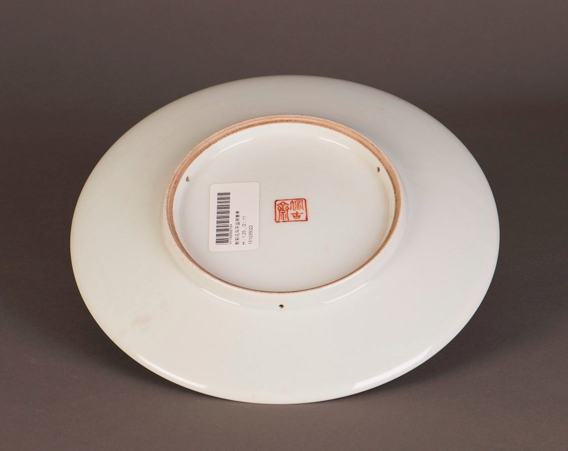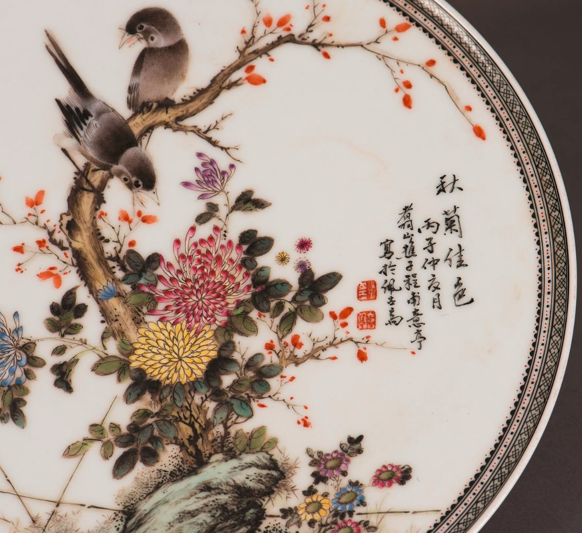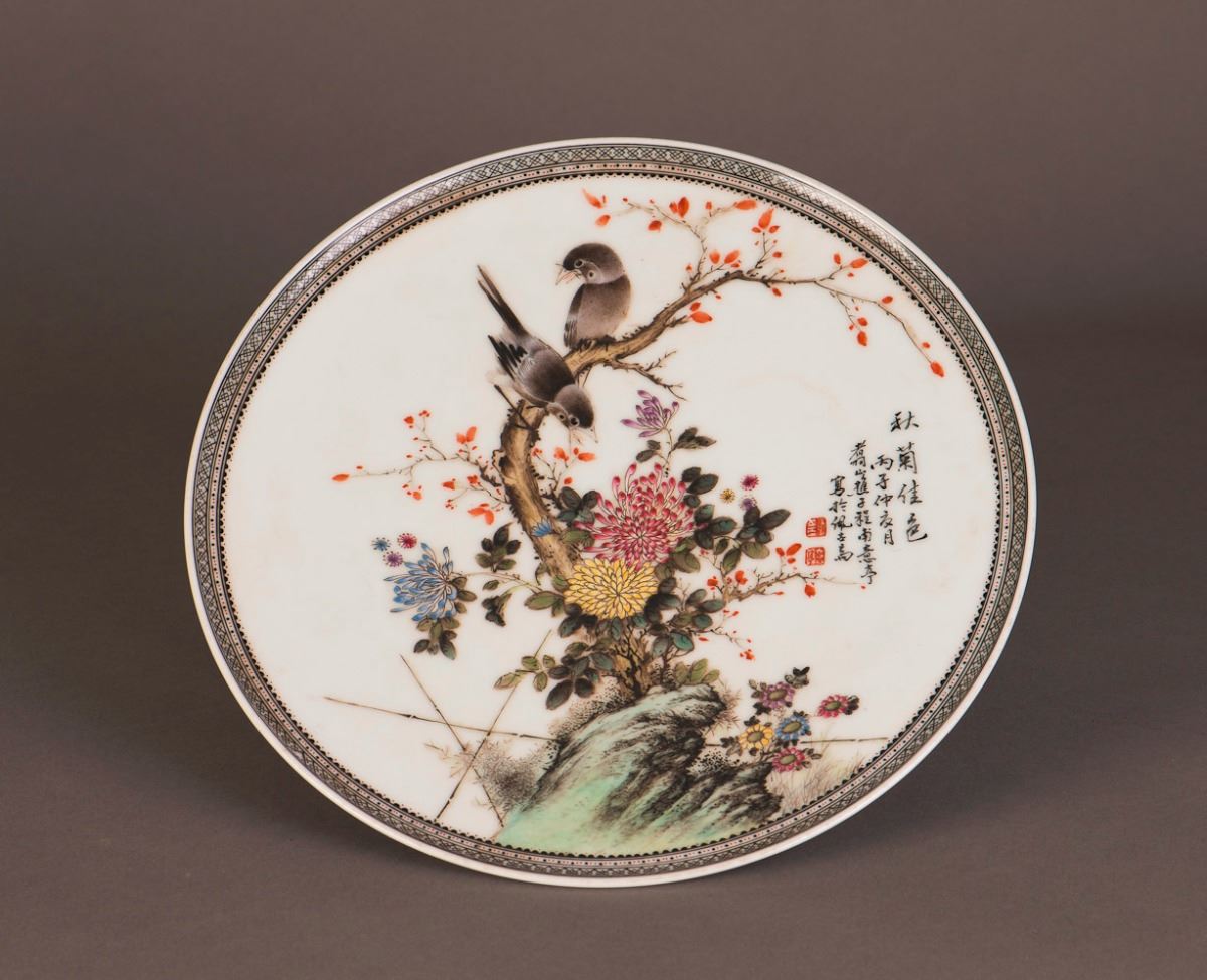 A Chinese porcelain plate decorated with chrysanthemum and birds motif painting, sealed with calligraphy inscription on the front, attributed to Cheng Yiting. Visible crack lines. Height 1.25" Diameter 11"