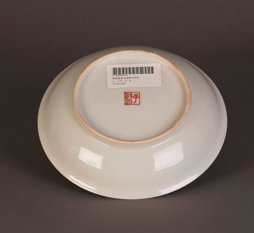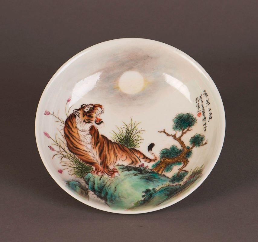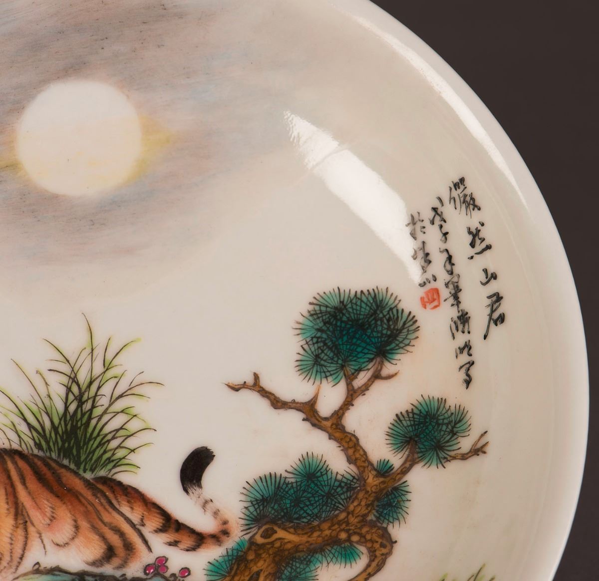 A Chinese famille rose porcelain plate featuring a roaring tiger atop a craggy rock by the pine tree, sealed with calligraphy inscription on the front, attributed to Bi Yuanming. Height 1.75" Diameter 8"