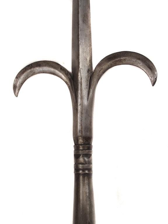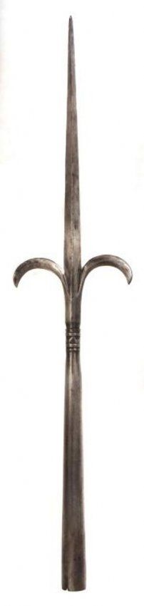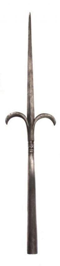 A rare example, with long, tapered socket terminating in a profiled bead, from which develops a pair of hooks separated by a short fuller, and a massive central spike of rhomboid section. .Late 18th century. Overall length 84 cm.