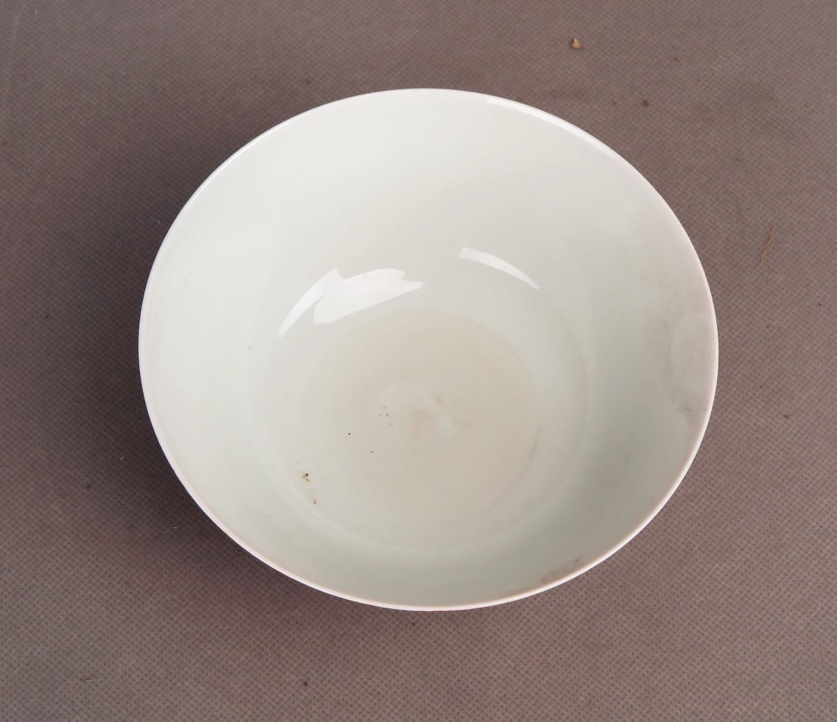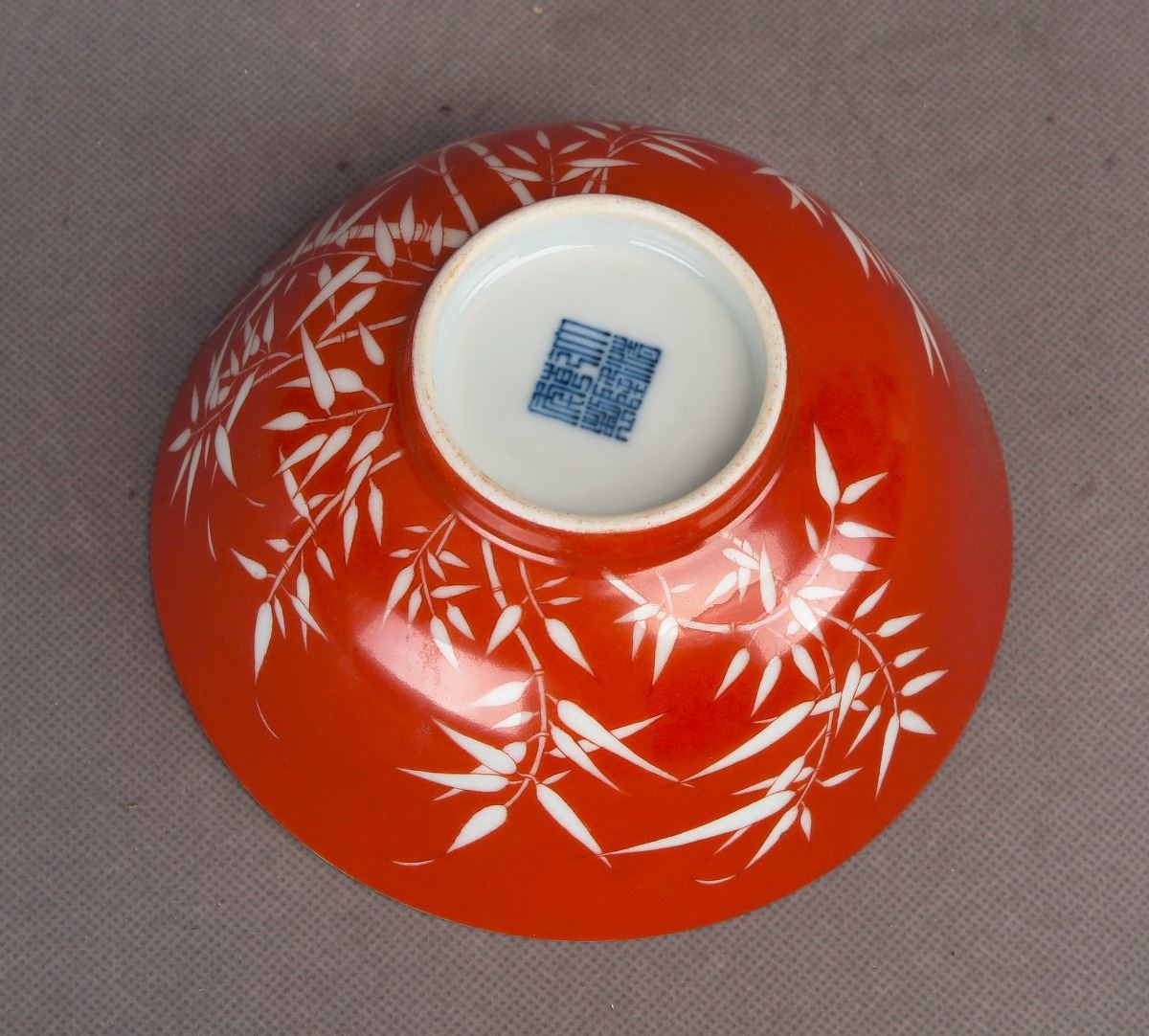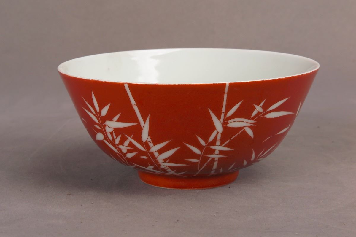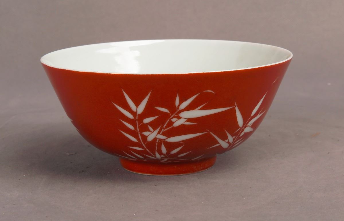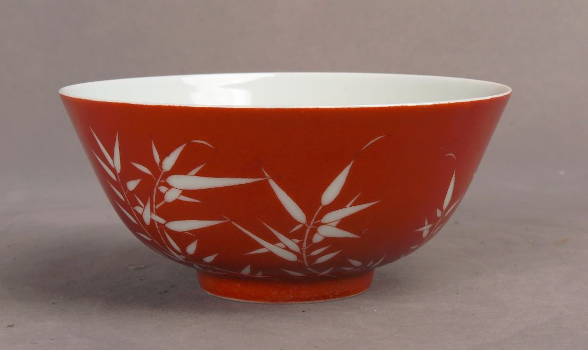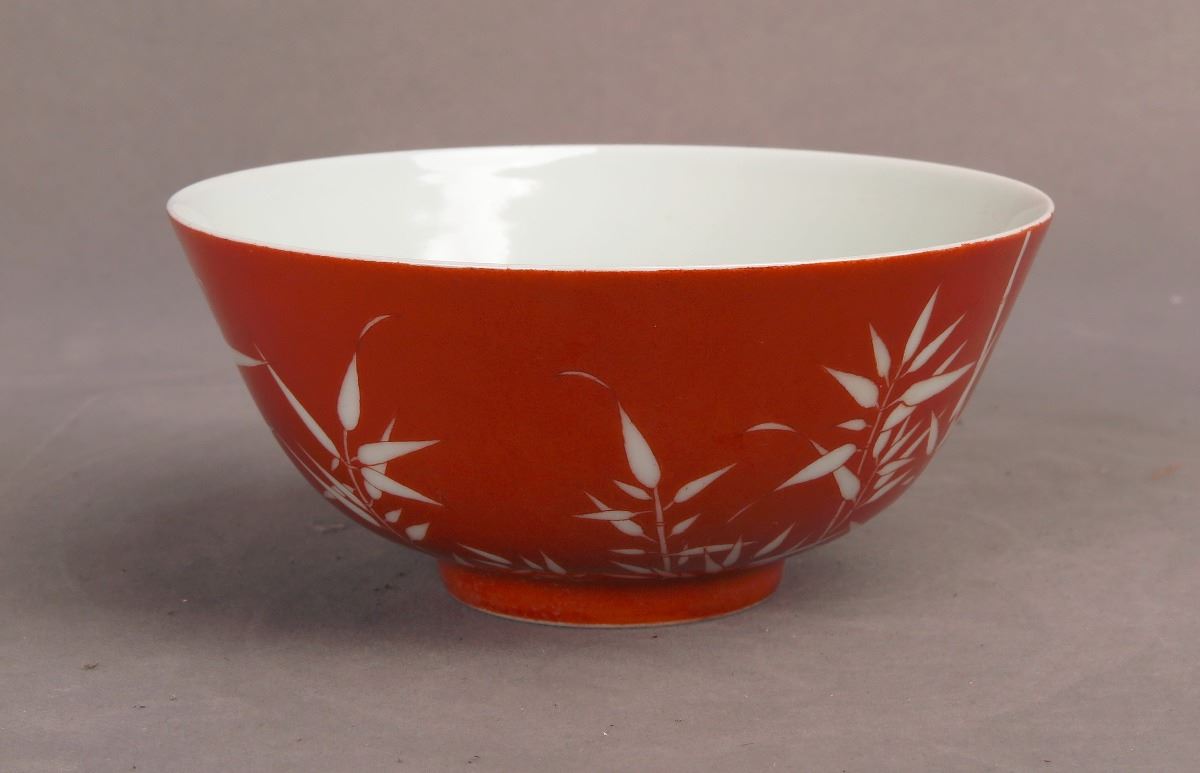 A Chinese red-glazed porcelain bowl decorated with white-glazed bamboo leaves, bearing a seal of Made in Qing Qian Long Period seal on a recessed base. Height2.75", Diameter 5.75"