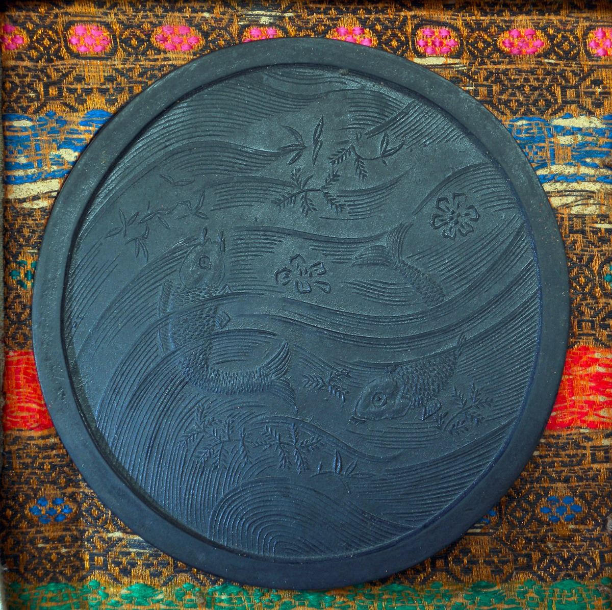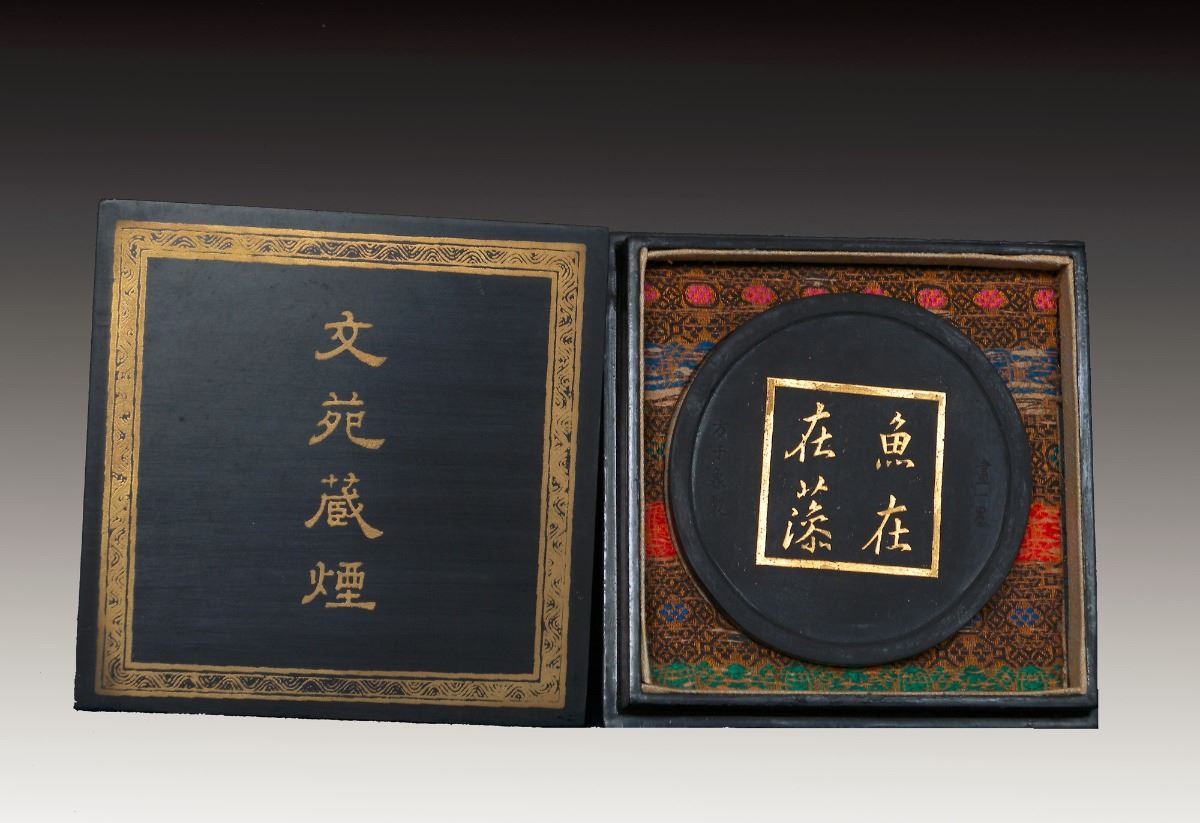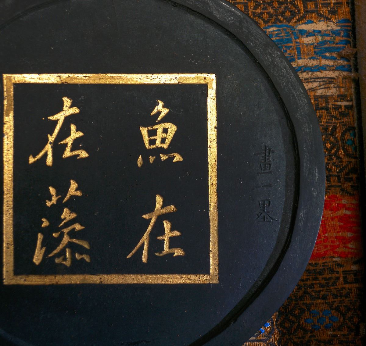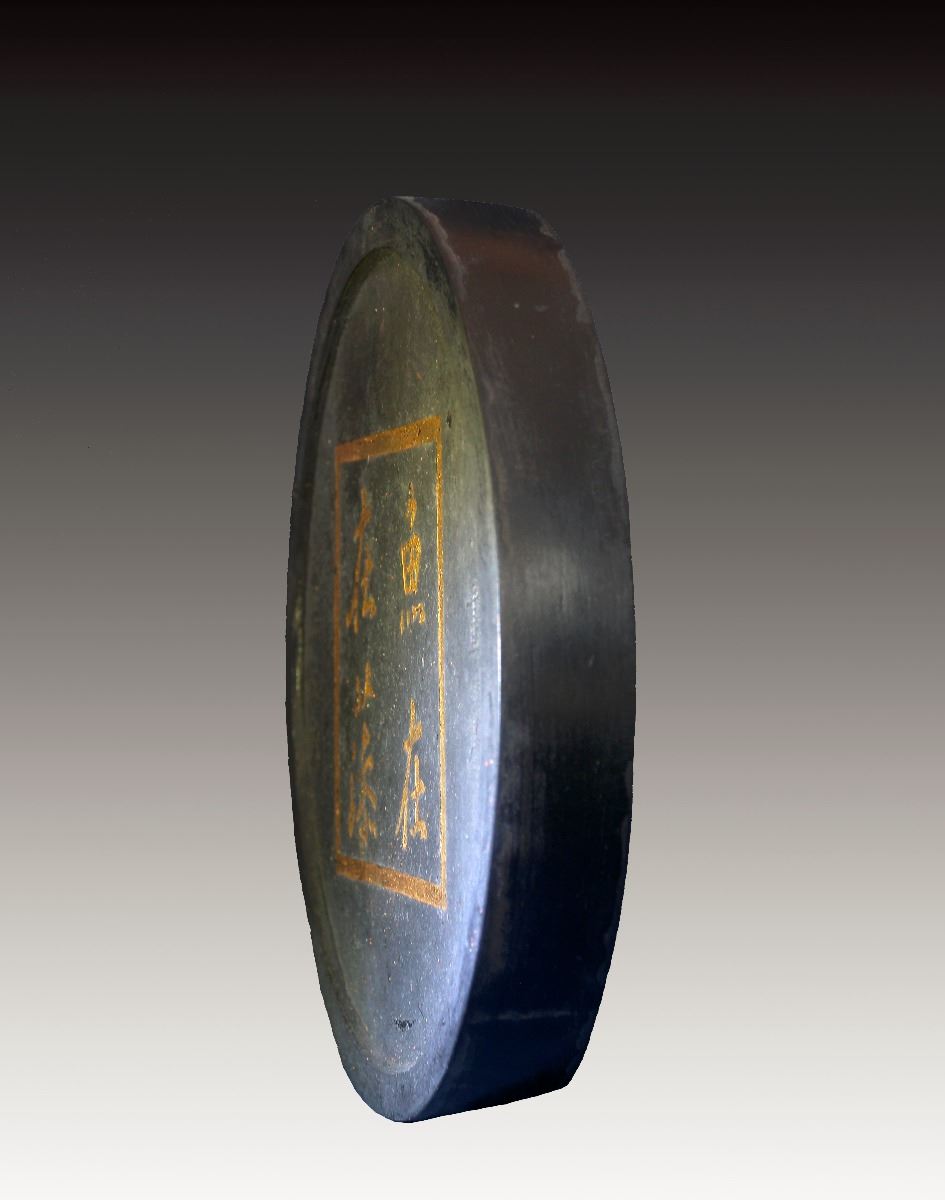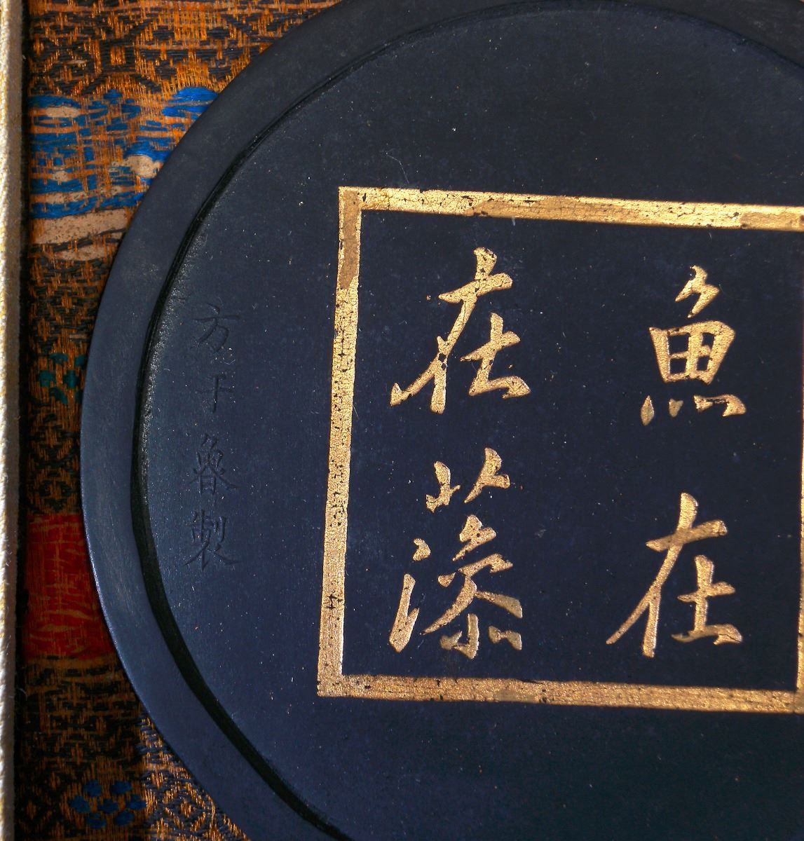 A Chinese round ink with characters on the exterior and low relief of fish and waves on the interior, Fang Yu Lu mark. 3.5"×3"×0.5"