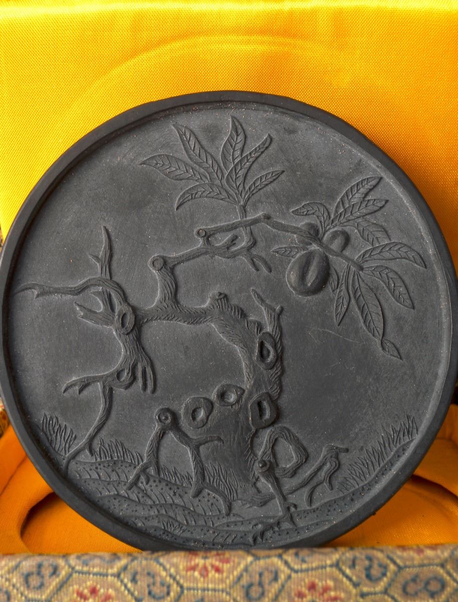 A Chinese round ink with characters on the exterior and low relief of a tree on the interior, Qin Geng Cao Tang Collection mark. 3.75"×3.75"×0.5"