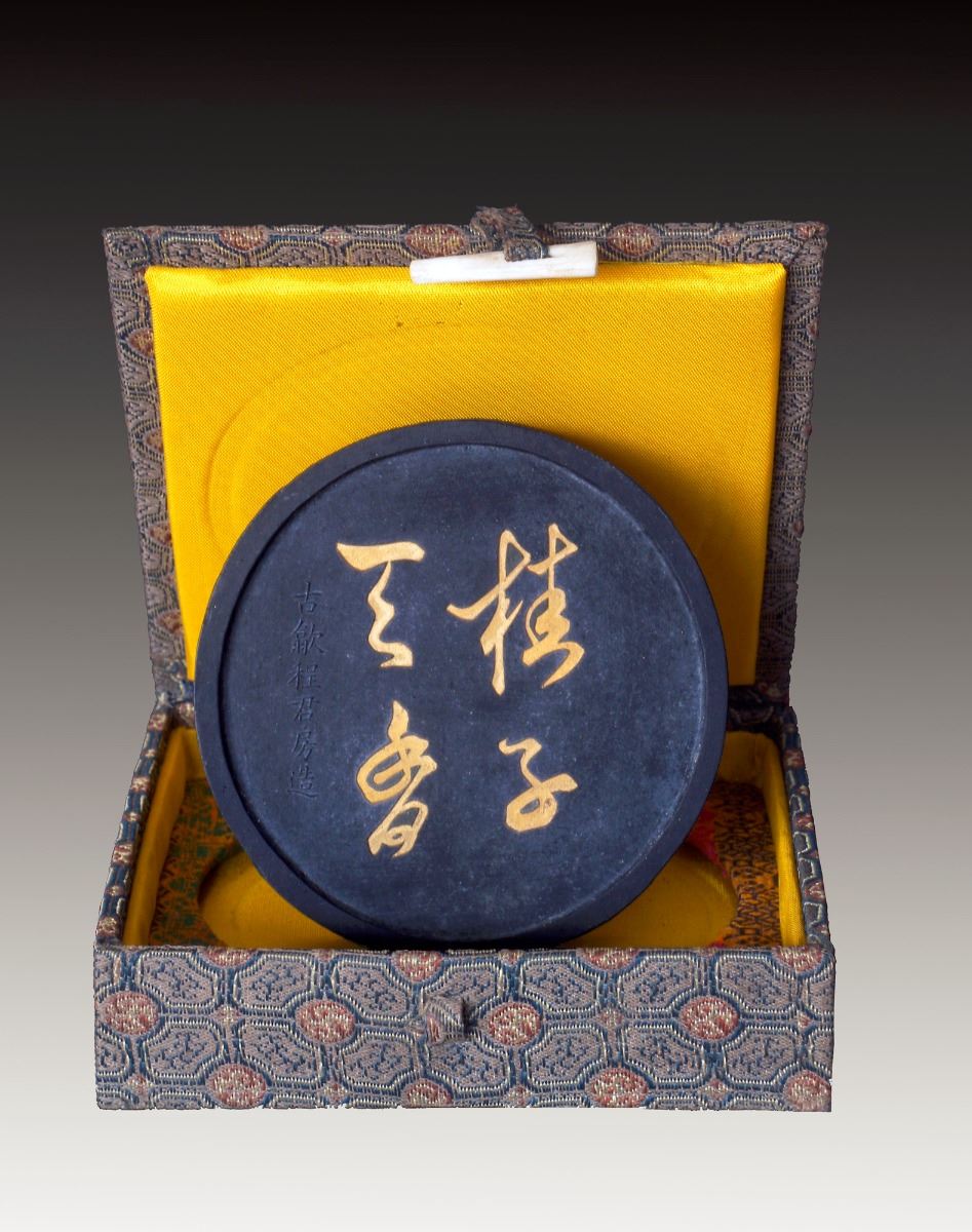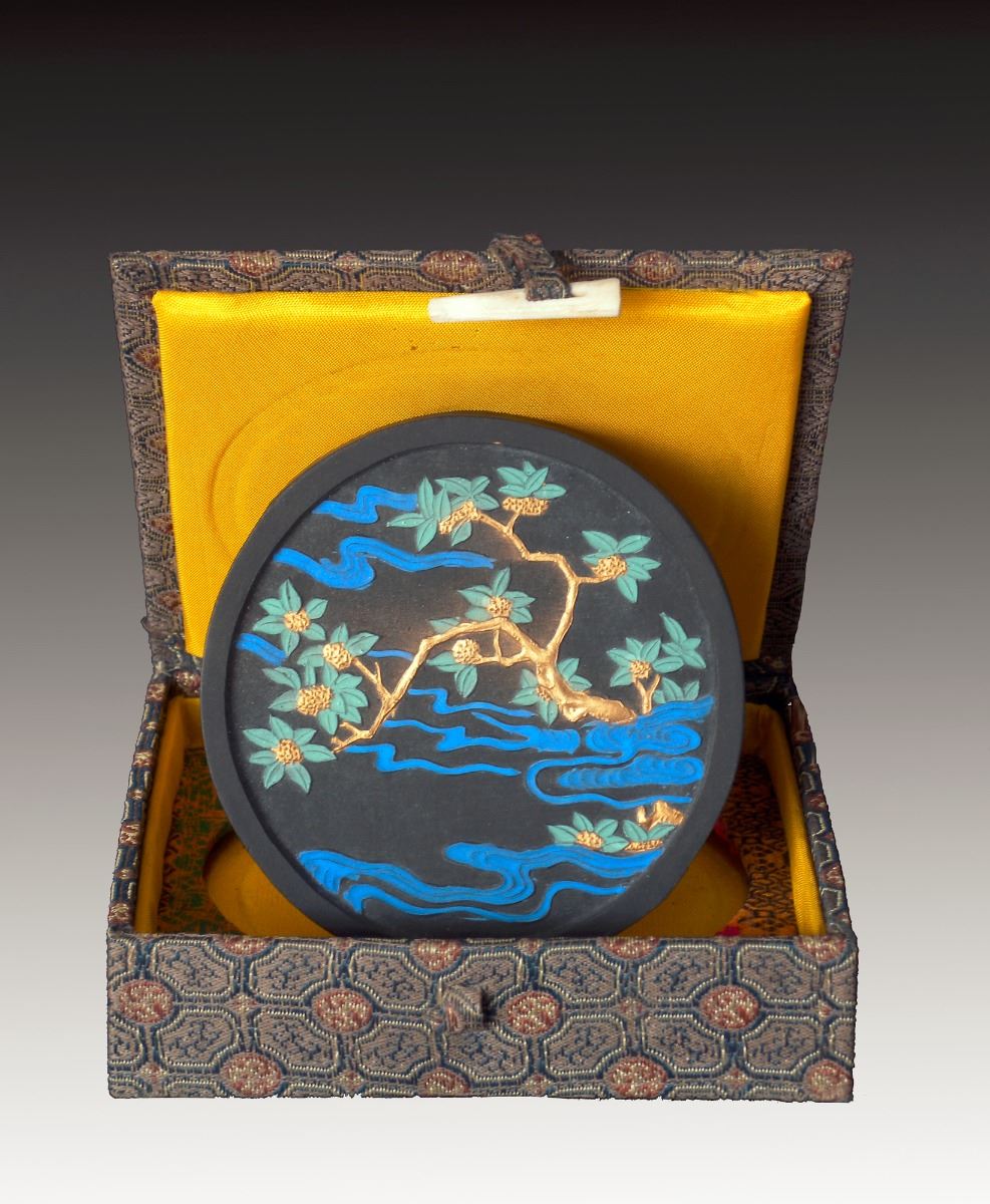 A Chinese round ink with characters on the exterior and low relief of flowers and trees in polychrome on the interior, Made by Gu Xi Cheng Jun Fang mark. 3.5"×3.5"×0.5"