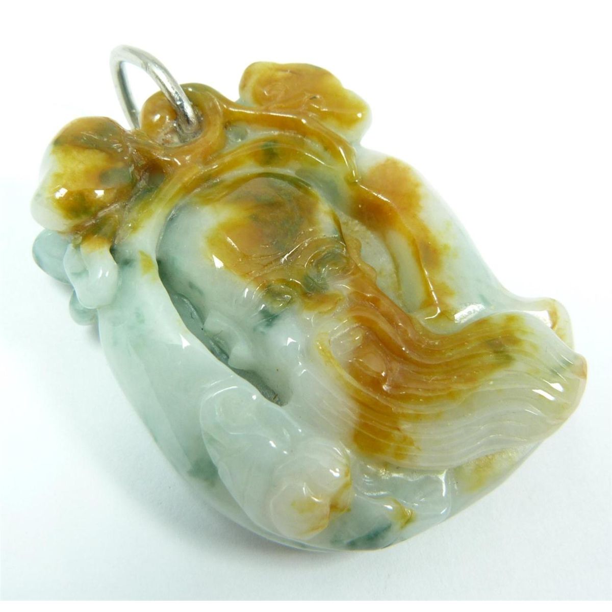 A Chinese relief carved Shou Xing pendant with peaches and lingzhi. Measures 1 7/8" length x 1 1/2" width (4.7cm x 3.8cm). Total weight of 47 grams.