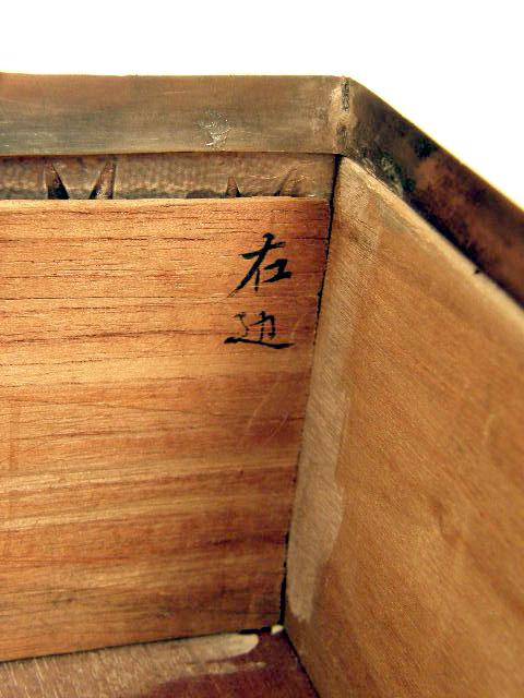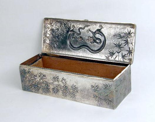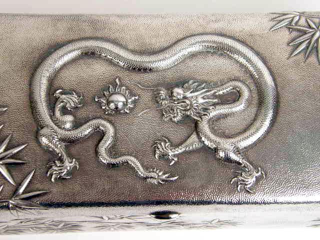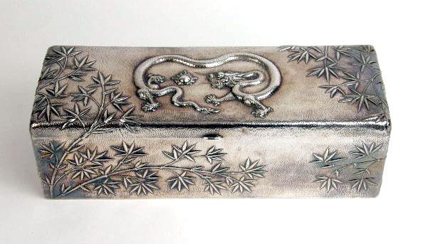 Hand-hammered with a chased dragon and bamboo motif 4 1/8"h x 13 1/2"w x 5"l