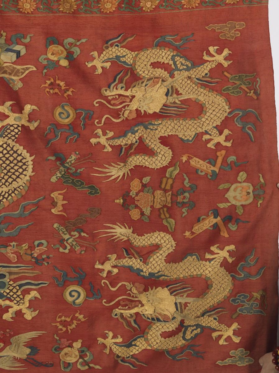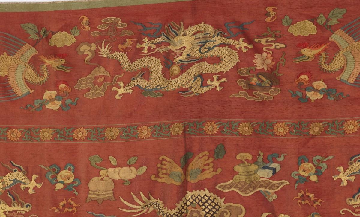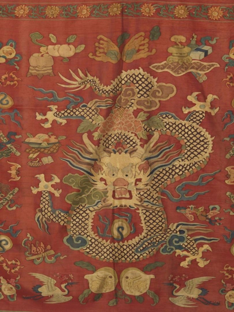 Chinese Six Dragon Kesi Embroidery. Polychrome Kesi Embroidery ground in crimson featuring six mythical five-clawed dragons chasing flaming pearls amid stylized clouds and fire. Auspicious symbols include vibrant phoenixes, longevity peaches, magical bats and filial elements. Length 79" Width 60"