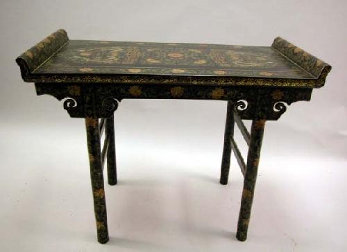 A CHINESE STYLE BLACK LACQUER AND POLYCHROME DECORATED ALTER TABLE; With shaped ends, scrolled apron and turned legs, 31"h x 39"w x 18 1/2"d