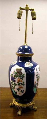 A CHINESE STYLE BLUE AND WHITE PORCELAIN GINGER JAR LAMP; On a leafy ormolu base with paw feet, 31"h