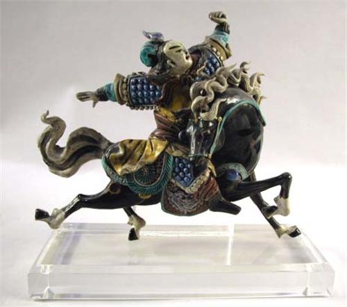 A CHINESE STYLE FIGURE ON HORSE BACK AND MOUNTED ON A LUCITE BASE.'