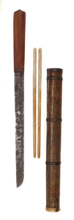 With dagger and chopsticks, in its rayskin scabbard.Mid-19th century. Blade pitted. Overall length 37.9 cm.