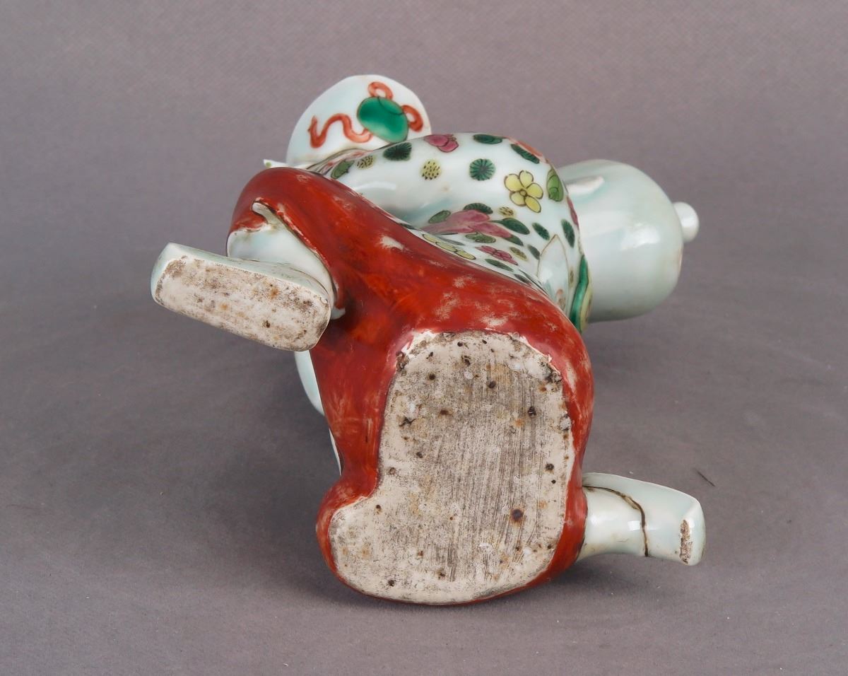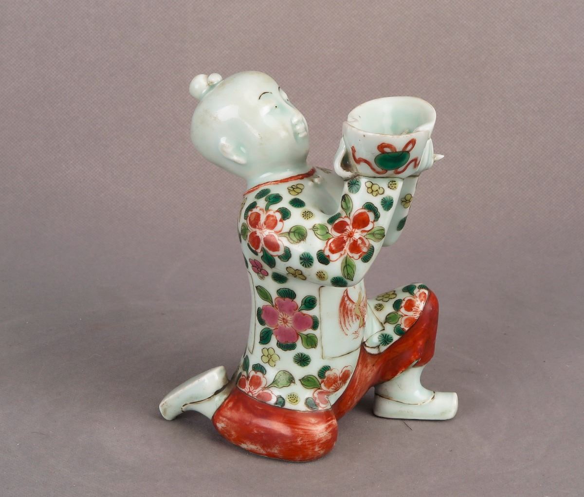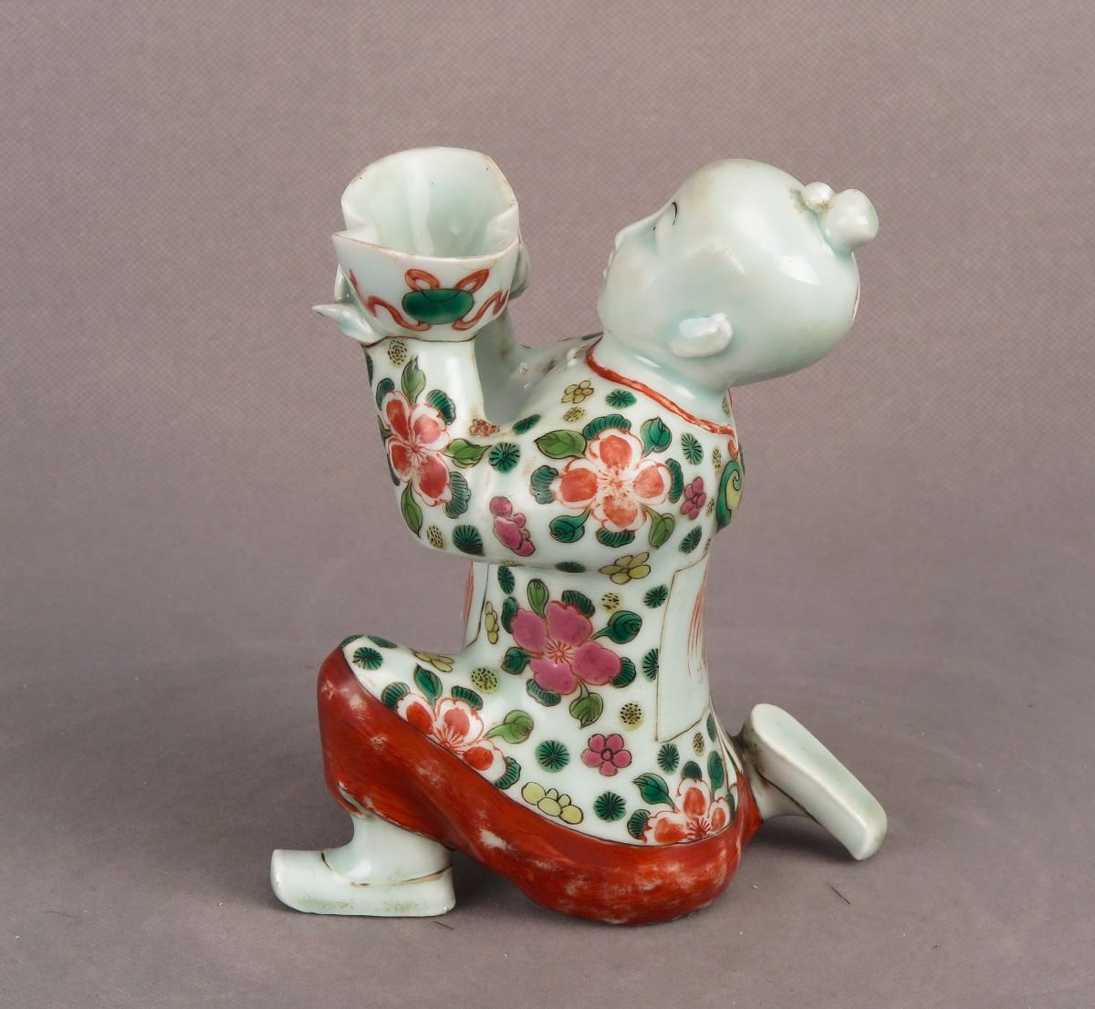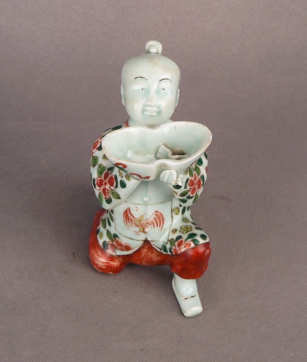 A Chinese wucai porcelain Tong Zi statue poised on one knee and holding up a tribute bowl over the head in respect. Height 6"
