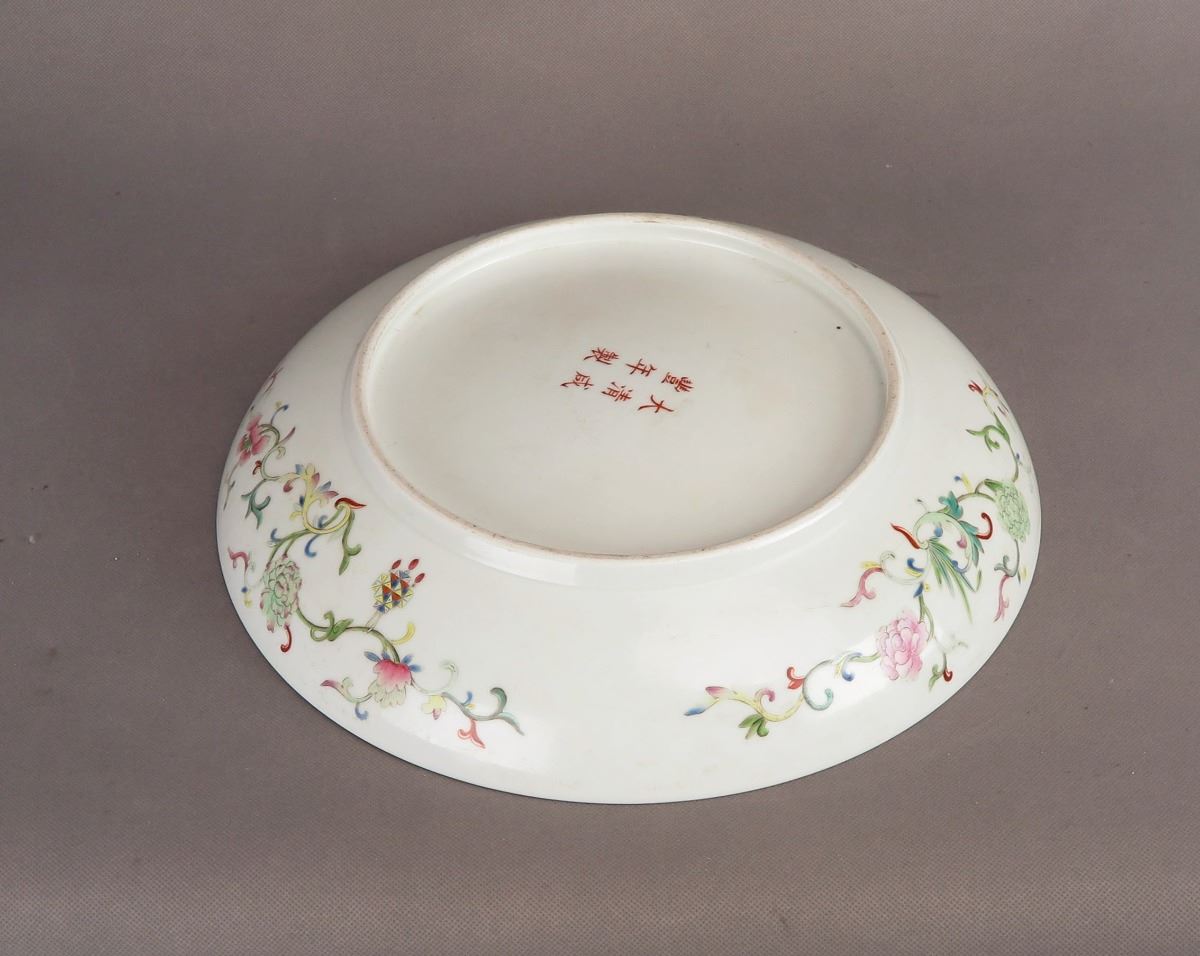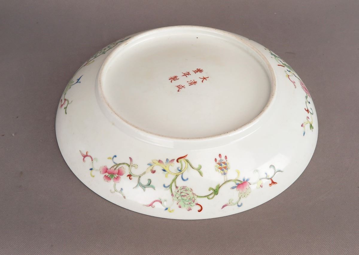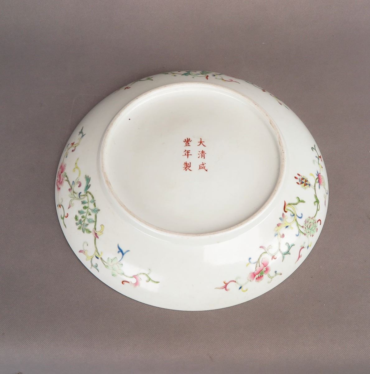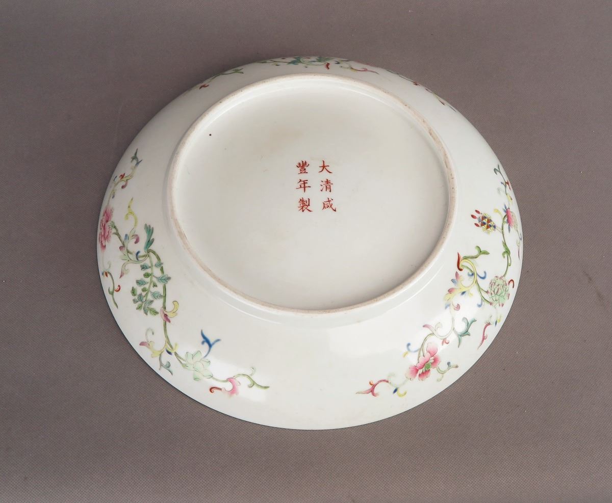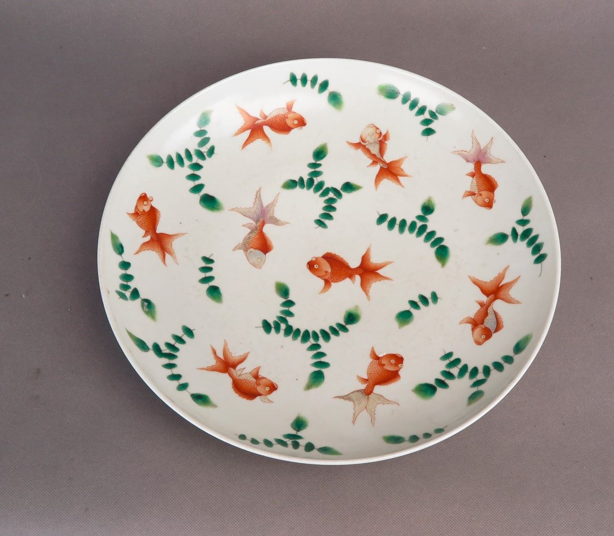 A Chinese white-glazed famille rose porcelain plate decorated with Jin Yu Man Tang painting featuring kois and foliage leaves in a well laid out form on the front, exterior with a band of foliage paintings, seal of Made in Qing Xian Feng Period imprinted on the base. Height 2.25", Mouth Diameter 13.25"