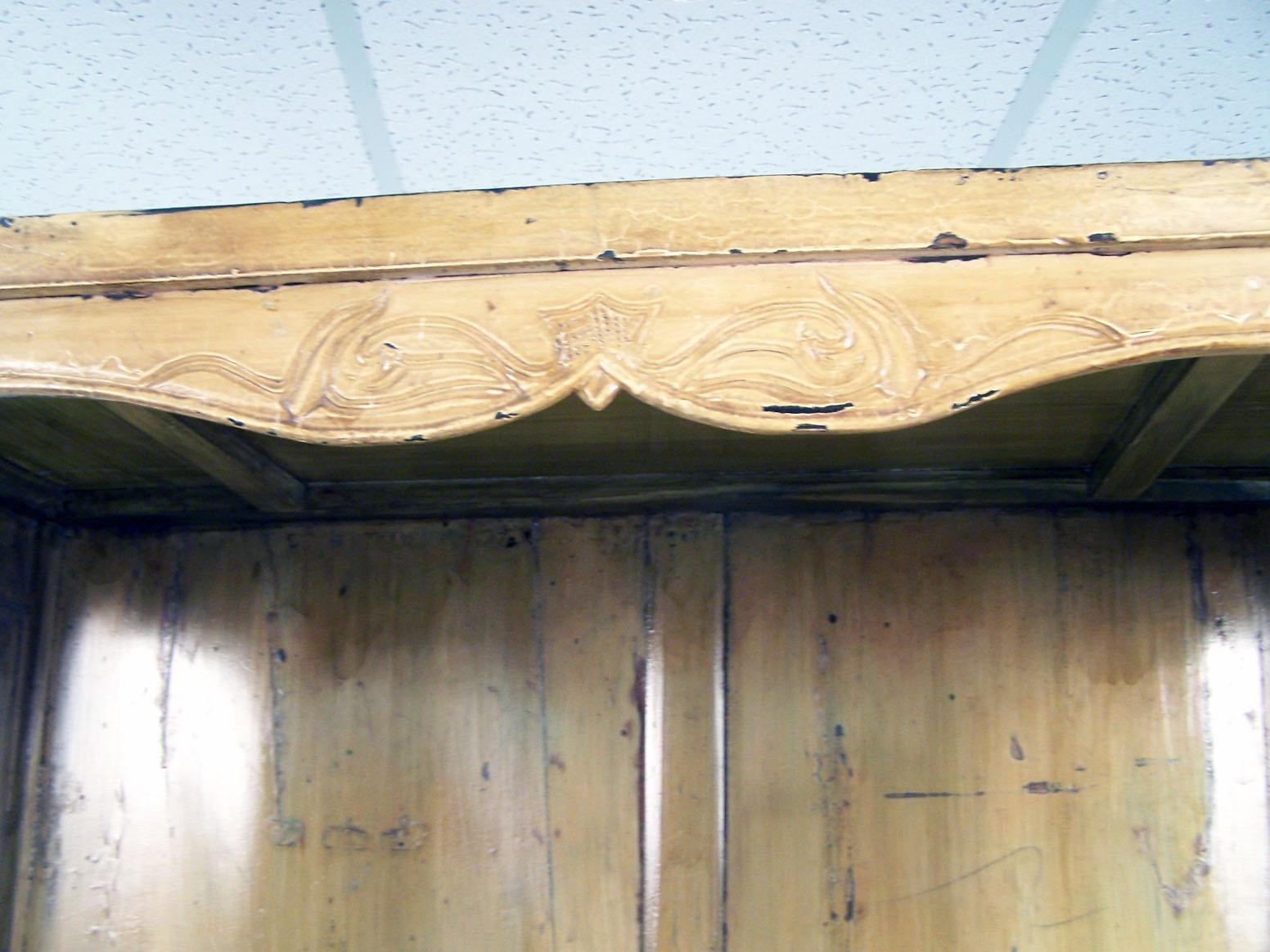 With incised decoration, the drawers opening to divided wells. 7`6 1/2"h x 45"w x 21"d Some losses to decoration.