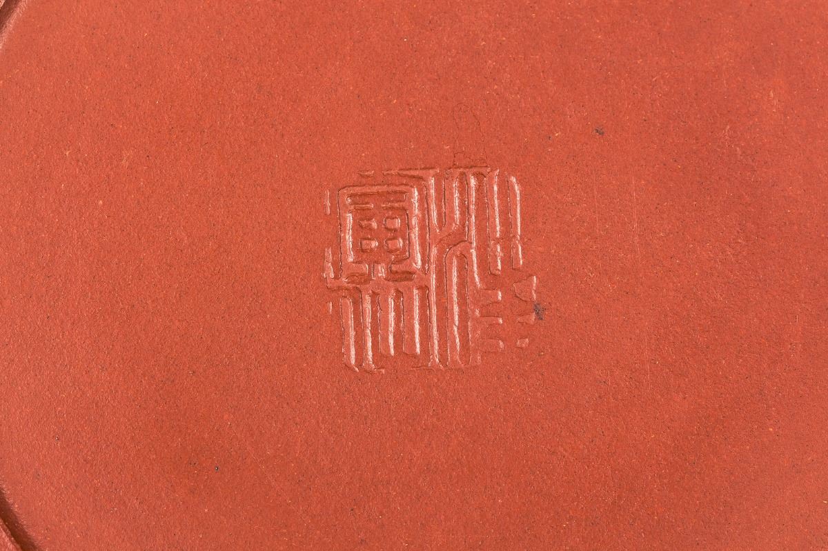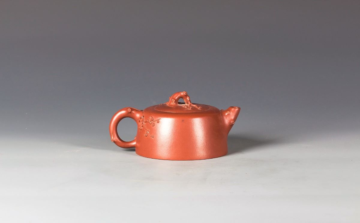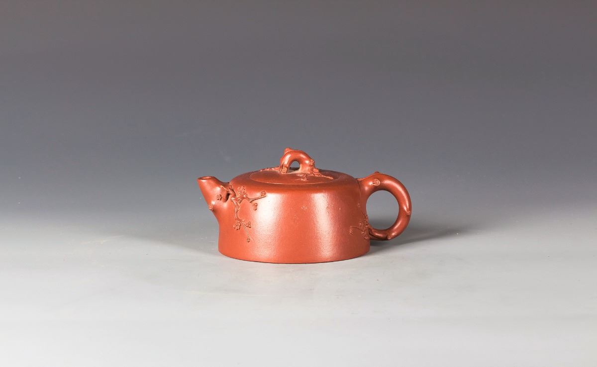 Chinese Yixing Zisha clay Teapot, carved the plum flowers around the top , mouth and handle. Mark with three calligraphy characters on the bottom. Length 5.5" Height 4"