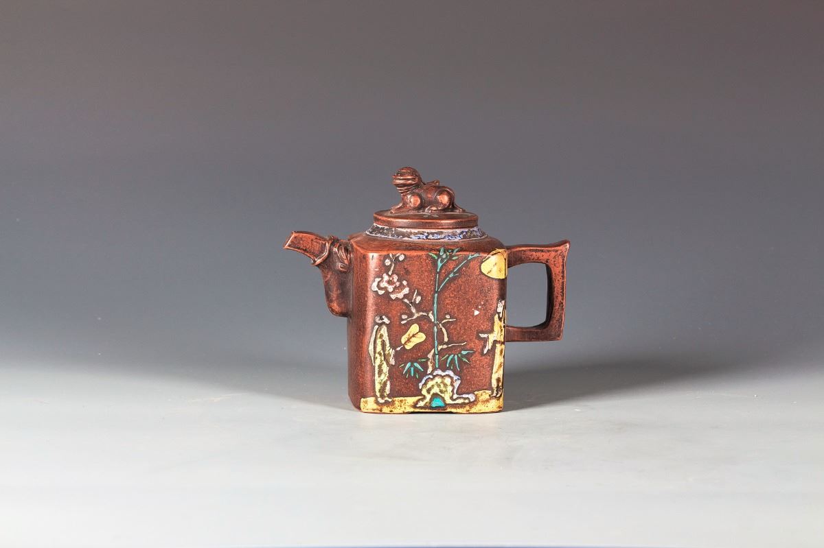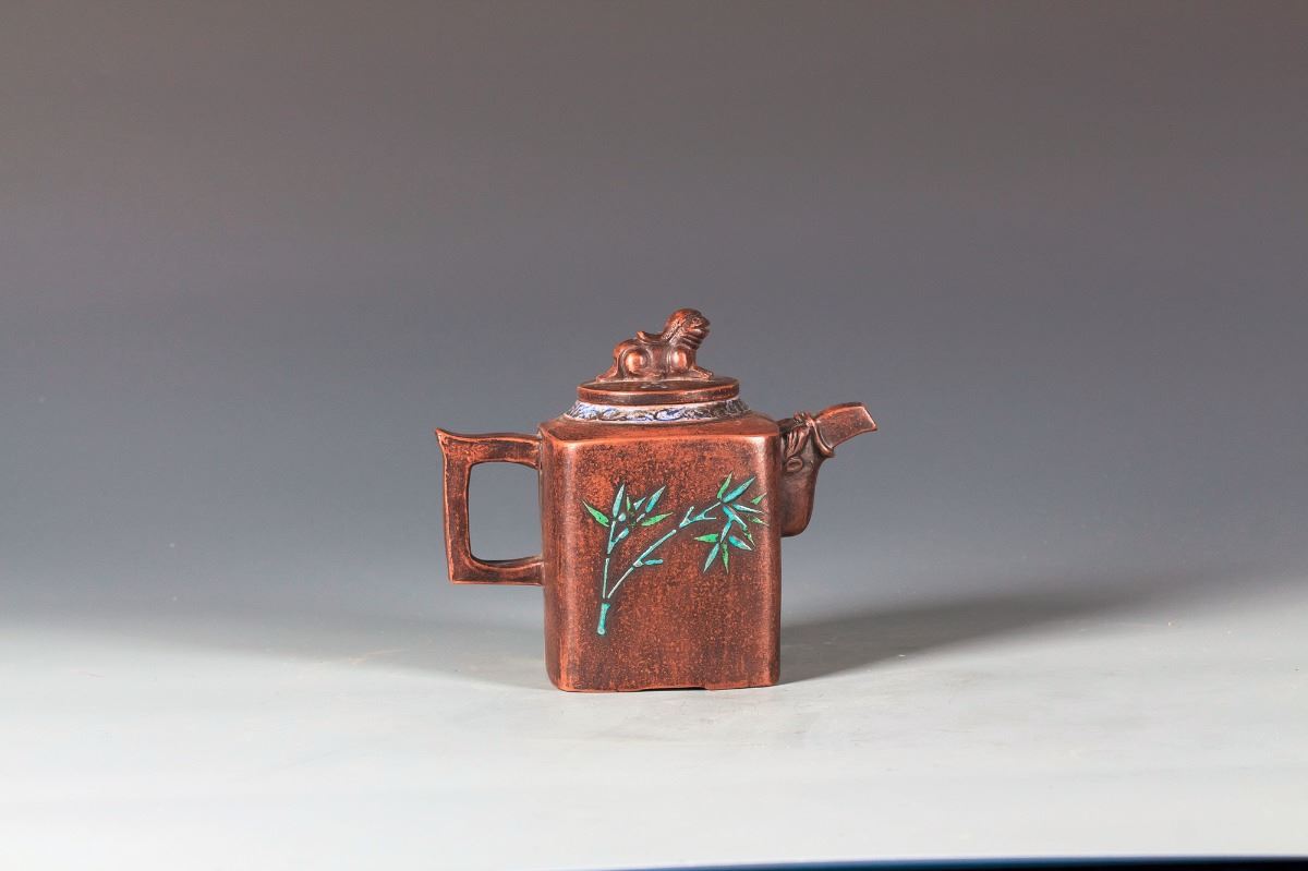 Chinese Zisha Clay Teapot, of cuboid form with square handle.painting with figures, bamboo and flowers, a beast crouching on the lid. Length 6.5" Width 3.5" Height 5.75"