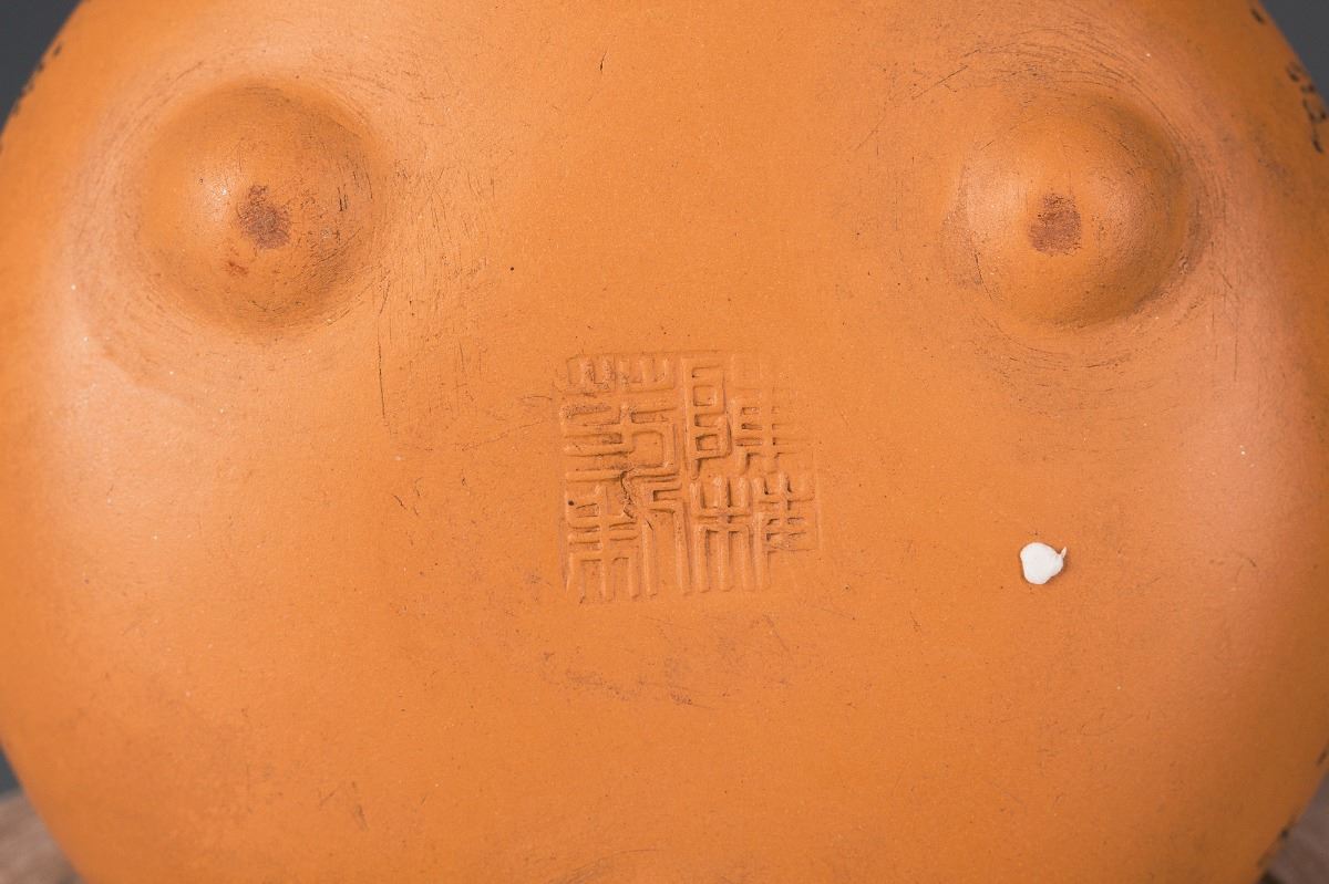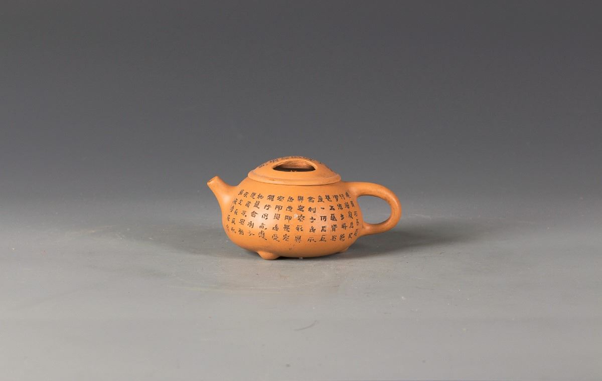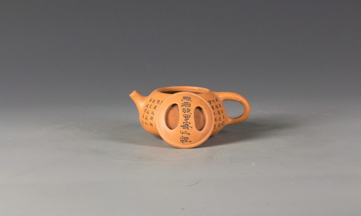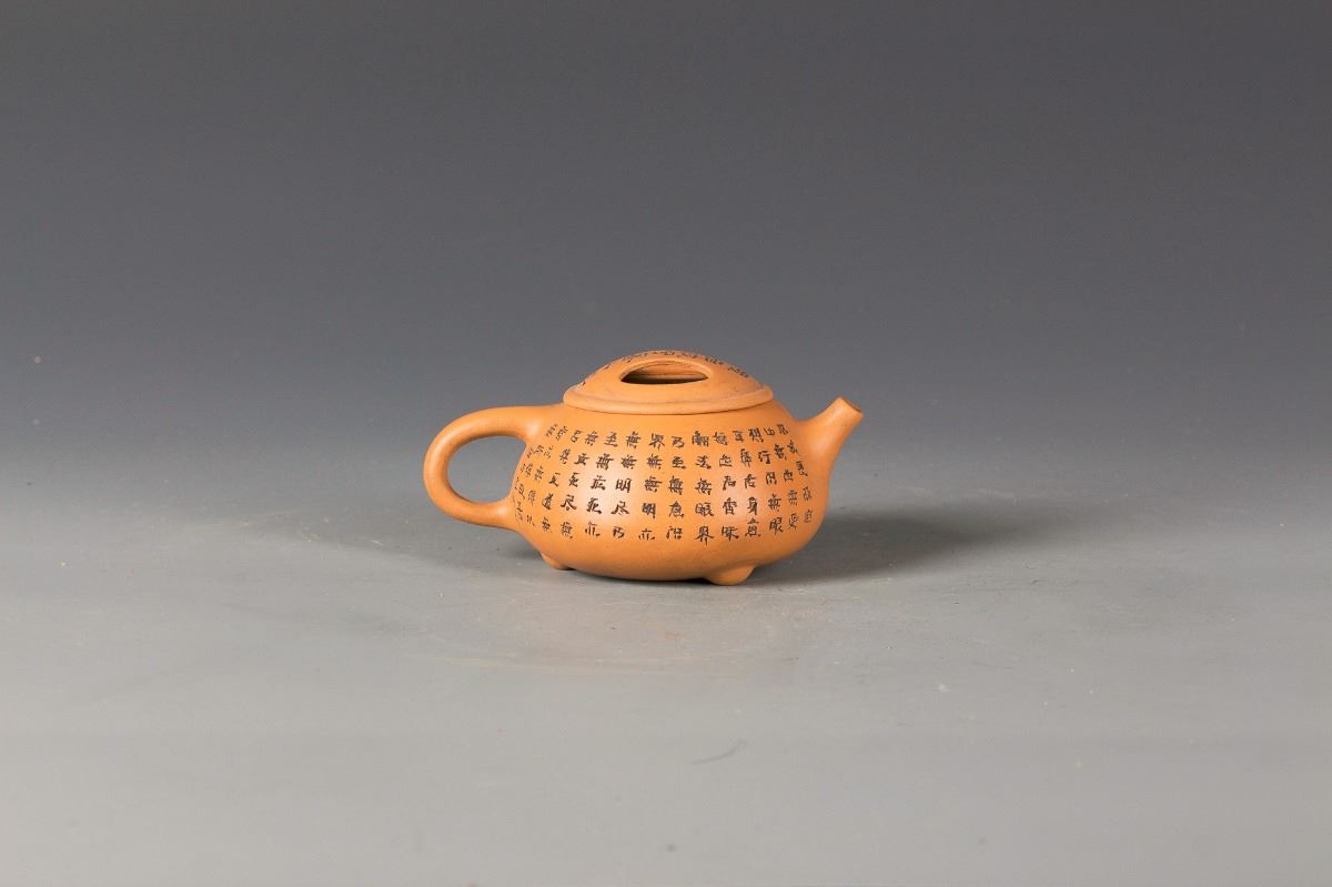 Chinese Zisha Clay Teapot with yellow tone. Carved with calligraphy characters of Sutra on the surface. Length 5.25" Width 3.75" Height 2.5"