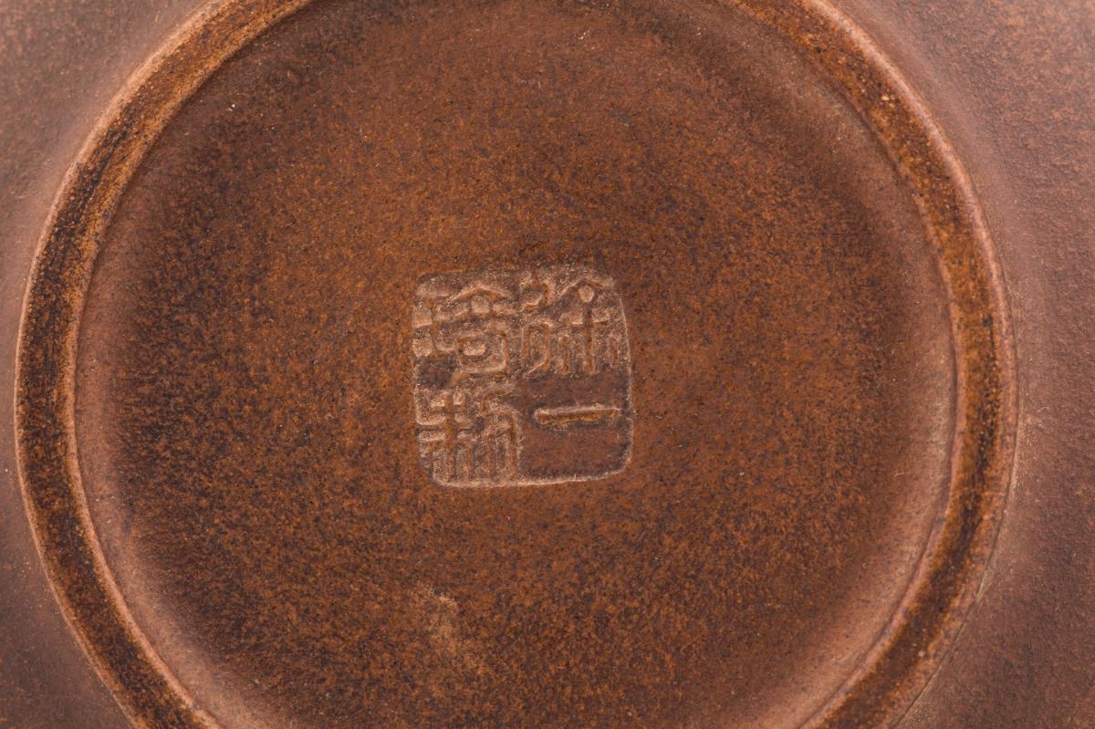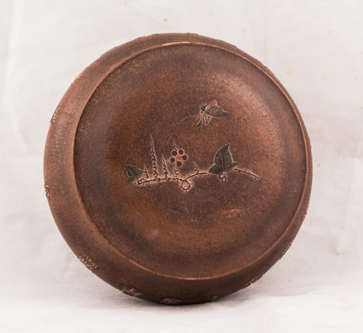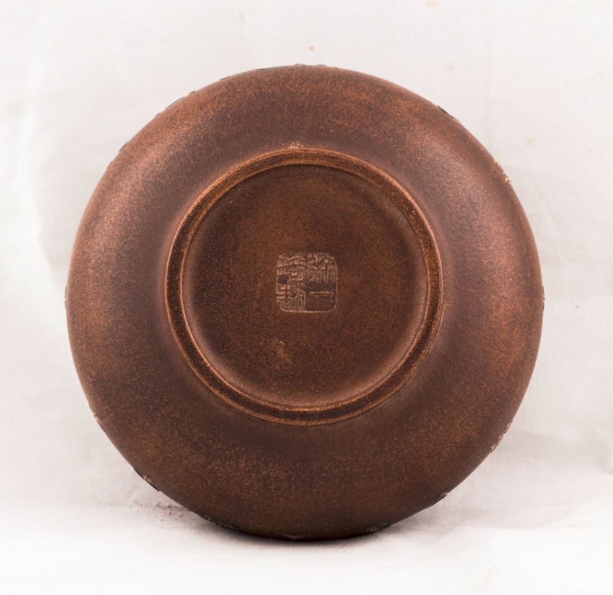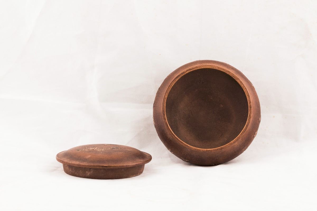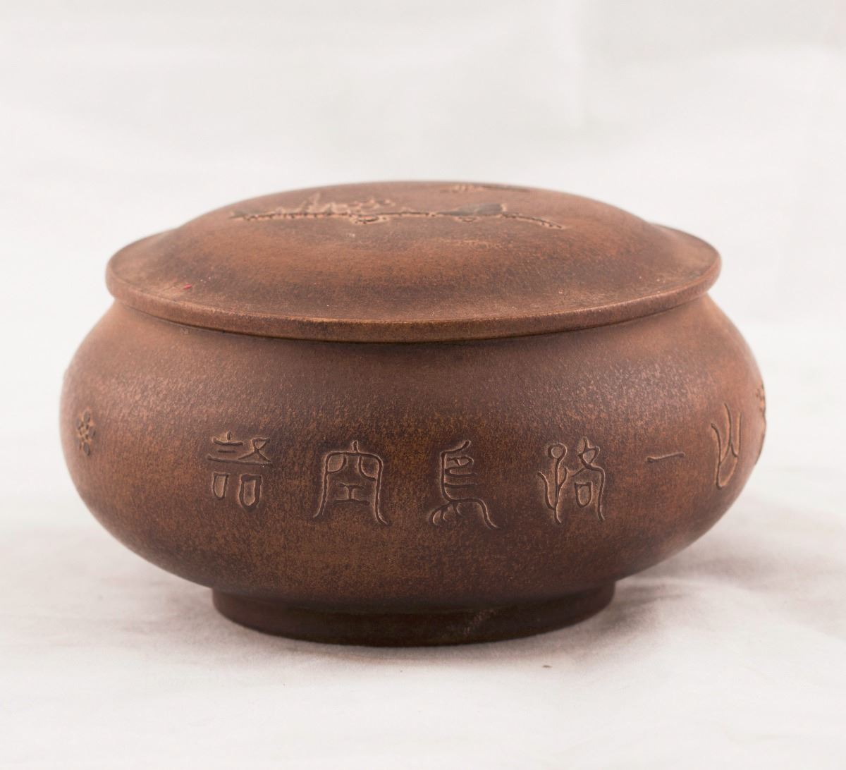 Chinese Zisha Yixing Clay Container with cover, carved with calligraphy characters. Signed and with seals on the bottom. Diameter 4.5" Height 2.5"