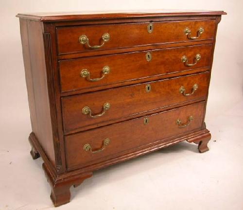 A CHIPPENDALE CHERRYWOOD, QUARTER-COLUMN CHEST OF DRAWERS; Pennsylvania, the molded top above lock-beaded drawers and ogee feet 33"h x 38"w x 20"d (some repairs) Appears to retain its original brass drawer pulls