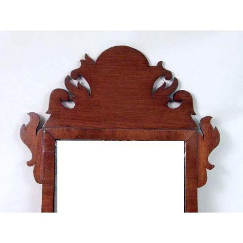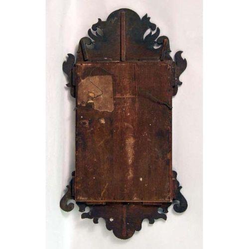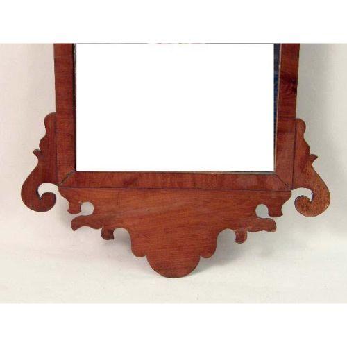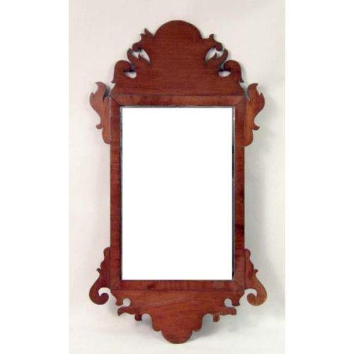 A CHIPPENDALE MAHOGANY LOOKING GLASS<BR><BR>American or English, patch and repair to lower left ear, 33"h x 18"w