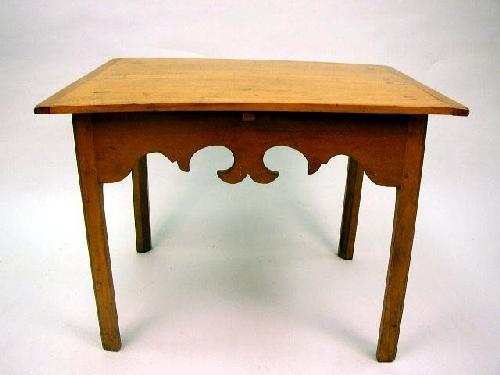 A CHIPPENDALE MAPLE LOW TABLE; New England rectangular "bread board" top above a shaped apron and square legs, altered, 21 1/2"h x 28 1/2"w x 21"d