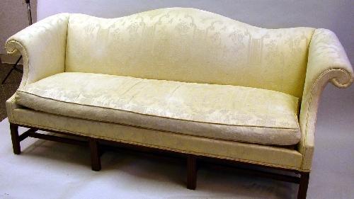 A CHIPPENDALE STYLE CAMELBACK SOFA; In the Pennsylvania tradition, of typical form on square molded legs, headed by volutes and joined by stretchers 7'l