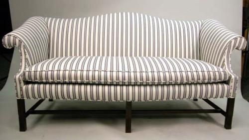 A CHIPPENDALE STYLE CAMELBACK SOFA; The serpentine crest with scrolled arms above a serpentine front seat rail and ending on square stop-fluted frontal legs 6'l