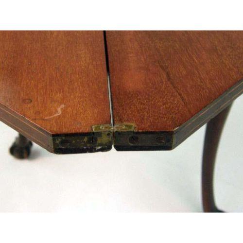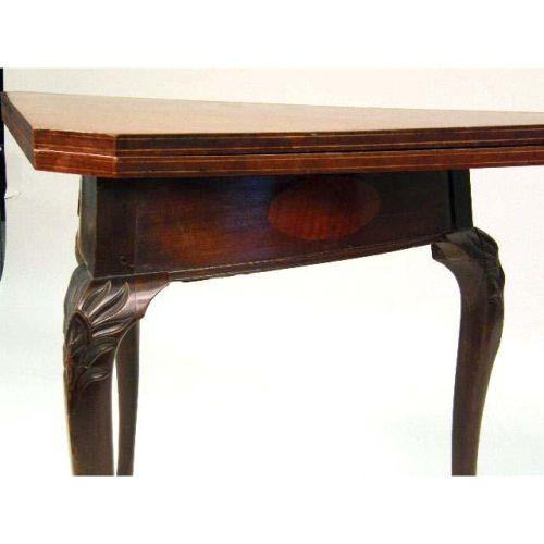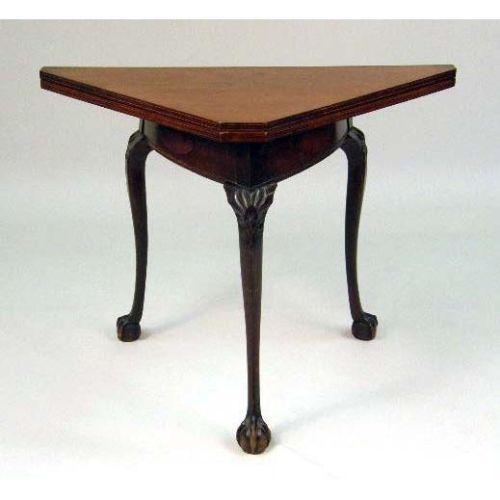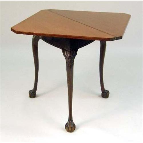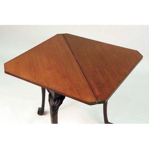 A CHIPPENDALE-STYLE CARVED MAHOGANY HANDKERCHIEF-FORM GAMES TABLE<BR><BR>each side having an oval of veneered hardwood