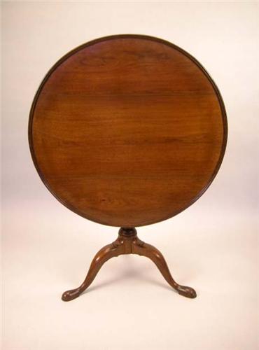A CHIPPENDALE WALNUT DISH TOP, BIRD CAGE TEA TABLE; Philadelphia, the circular hinged top circular top above a turned standard, downswept legs and snake feet 28"h x 33"d, restored