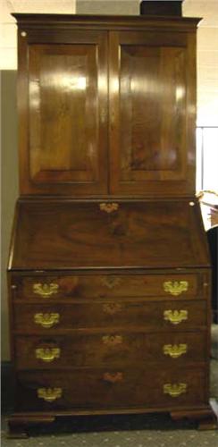 A CHIPPENDALE WALNUT SECRETARY DESK-AND-BOOKCASE; Pennsylvania, in two parts, with a paneled bookcase, the desk with removable prospect section and long drawers on a bracket base, restored, 6'6"h x 36"w x 19 1/2"d