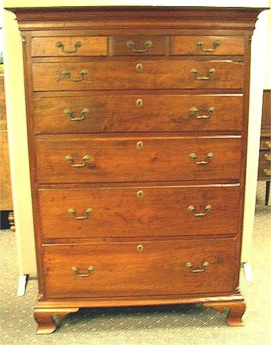 A CHIPPENDALE WALNUT TALL CHEST OF DRAWERS; Pennsylvania, the overhanging cornice above an arrangement of three short and five graduated long drawers, ending on ogee bracket feet (feet of a later date) 5'4 1/4"h x 40 1/2"w x 22 1/4"d