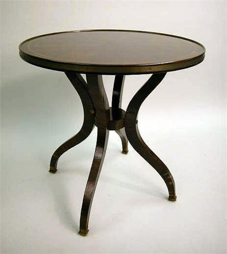 A CIRCULAR BRASS-INLAID MAHOGANY CENTER TABLE; chips and losses to veneer, 27 1/2"h x 27 3/4"d