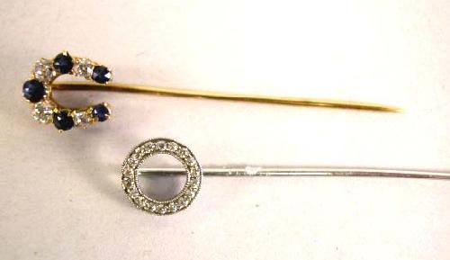 A CIRCULAR DIAMOND STICK PIN; Set with 18 small diamonds, weighing apx. .20 ct., together with horseshoe diamond and sapphire stick pin
