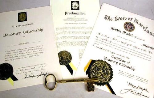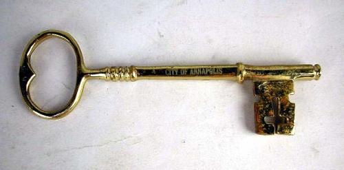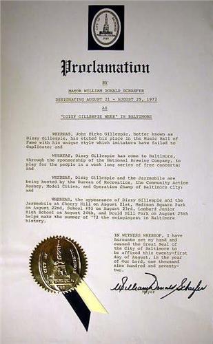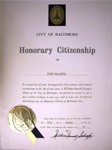 A CITY OF ANNAPOLIS, MARYLAND BRASS KEY TO THE CITY Inscribed "Dizzy Gillespie", heavy tarnishing, together with a proclamation by the mayor of Annapolis, a proclamation by Mayor William Donald Schaefer, City of Baltimore, designating August 21-August 25, 1972, "Dizzy Gillespie Week", August 21, 1972, a certificate honoring Dizzy Gillespie with Honorary Citizen of the City of Baltimore, August 21, 1972, and a certificate of honorary citizenship to the state of Maryland, 5 pieces