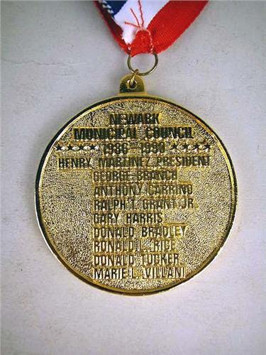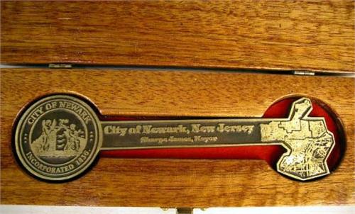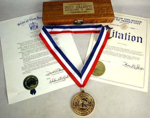 A CITY OF NEWARK, NEW JERSEY BRONZE KEY TO THE CITY Sharpe James, Mayor, housed in a wood box with engraved brass plaque: "Dizzy Gillespie August 5, 1989", together with a certificate from the office of the Mayor of Jersey City, New Jersey, honoring Dizzy Gillespie, signed Mayor Thomas F.X. Smith, dated October 31, 1979, a gold tone metal medallion, "Distinguished Recognition Award, Newark, New Jersey", depicting the city seal and inscribed on reverse side "Newark Municipal Council 1986-1990, Henry Martinez, President, George Branch, Anthony Carrino, Ralph T. Grant, Jr., Gary Harris, Donald Bradley, Ronald L. Rice, Donald Tucker, and Mariel L. Villan", 3" dia., and two copies of a New Jersey State Senate resolution honoring Dizzy, 5 pieces