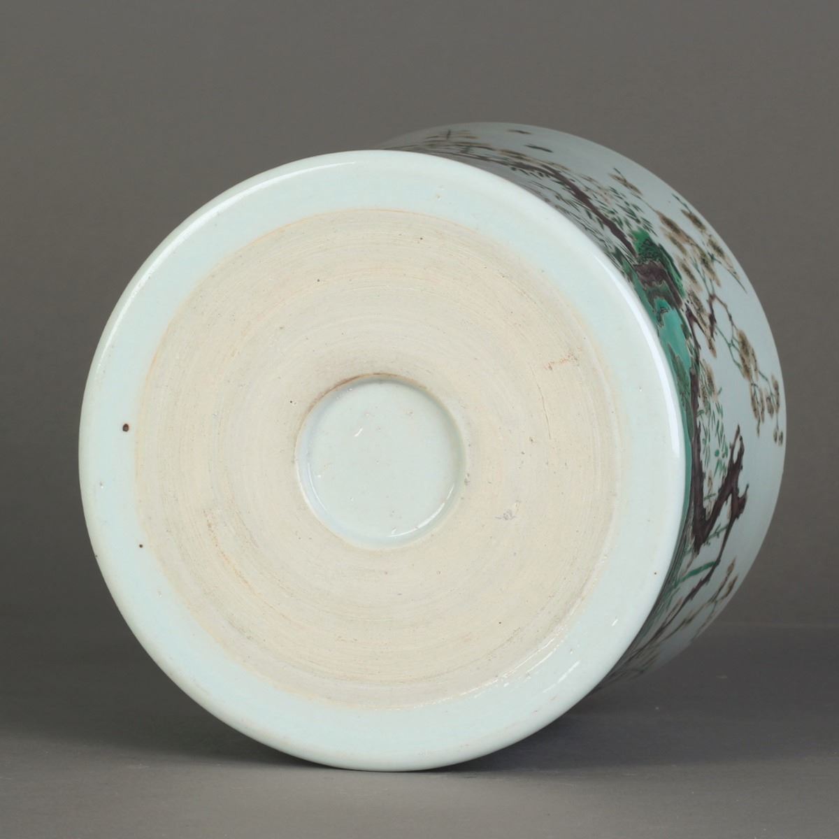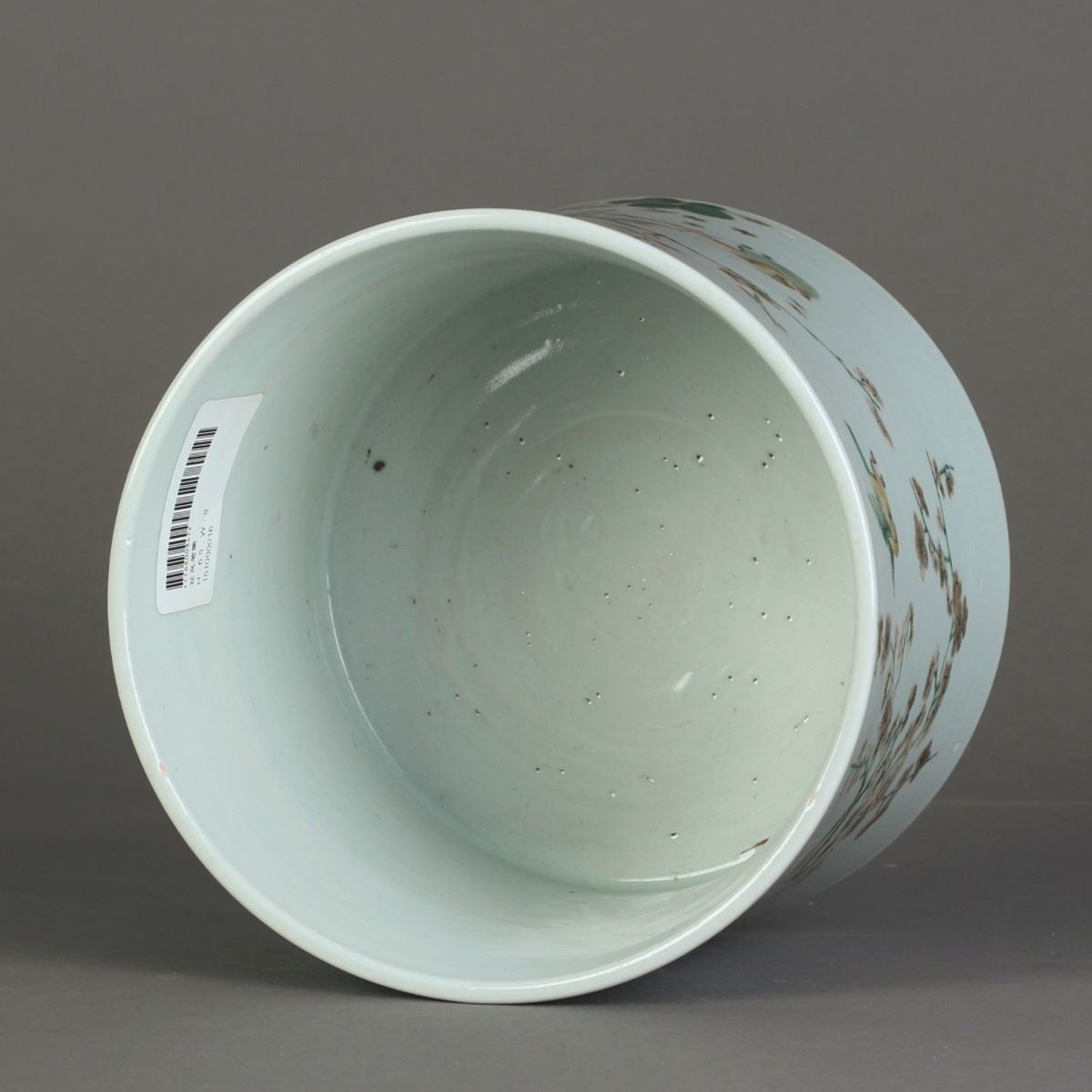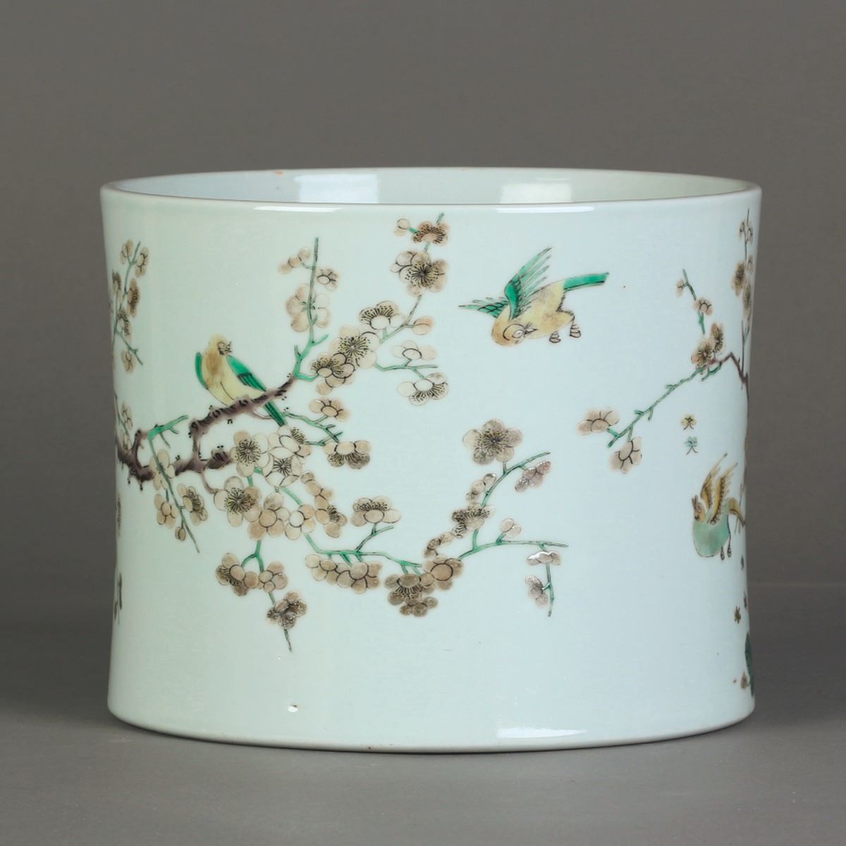 A classic famille rose porcelain brush pot, white-glazed with famille rose painting of plum flowers above rocks. Height 6.5" Width 8"