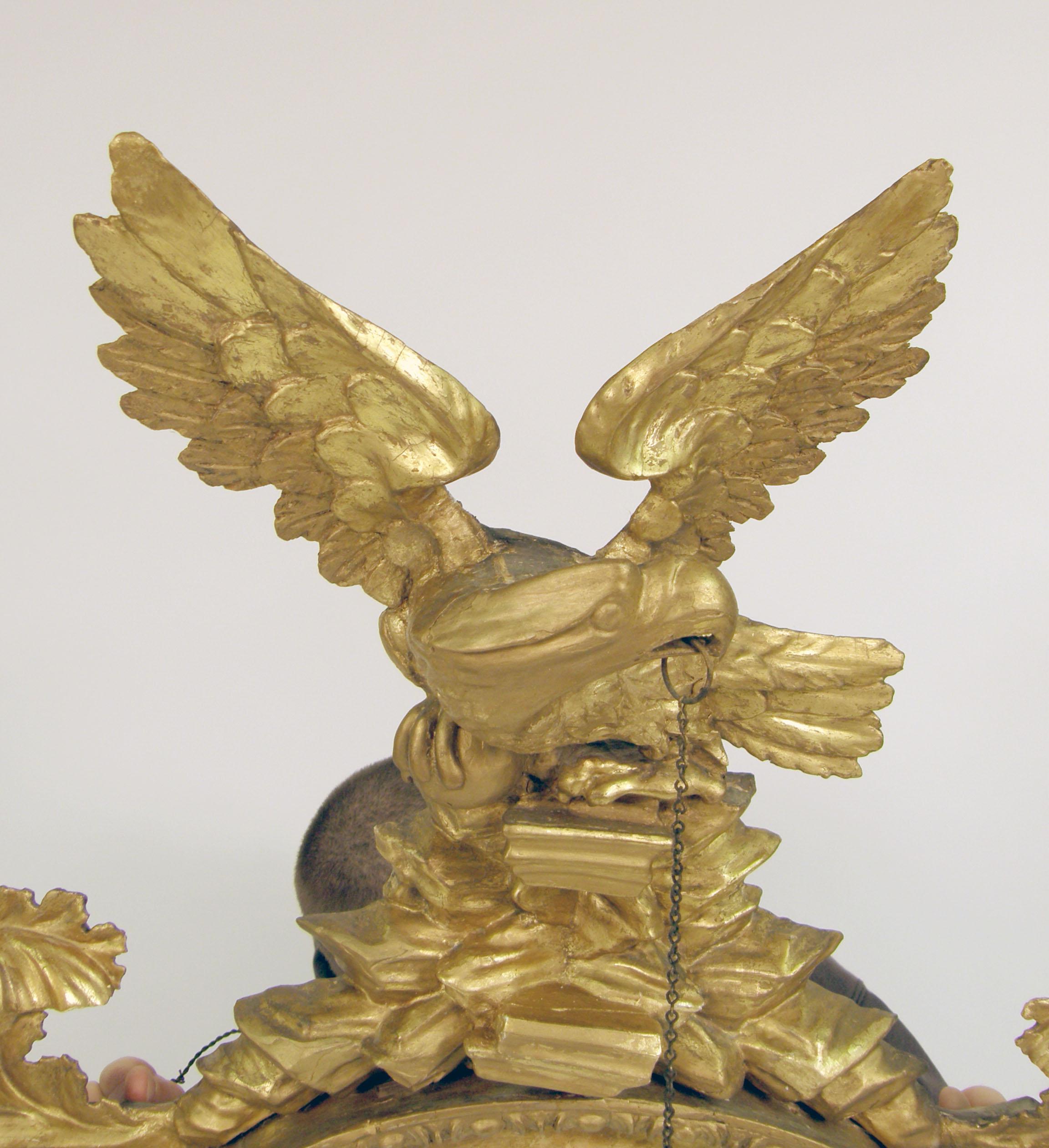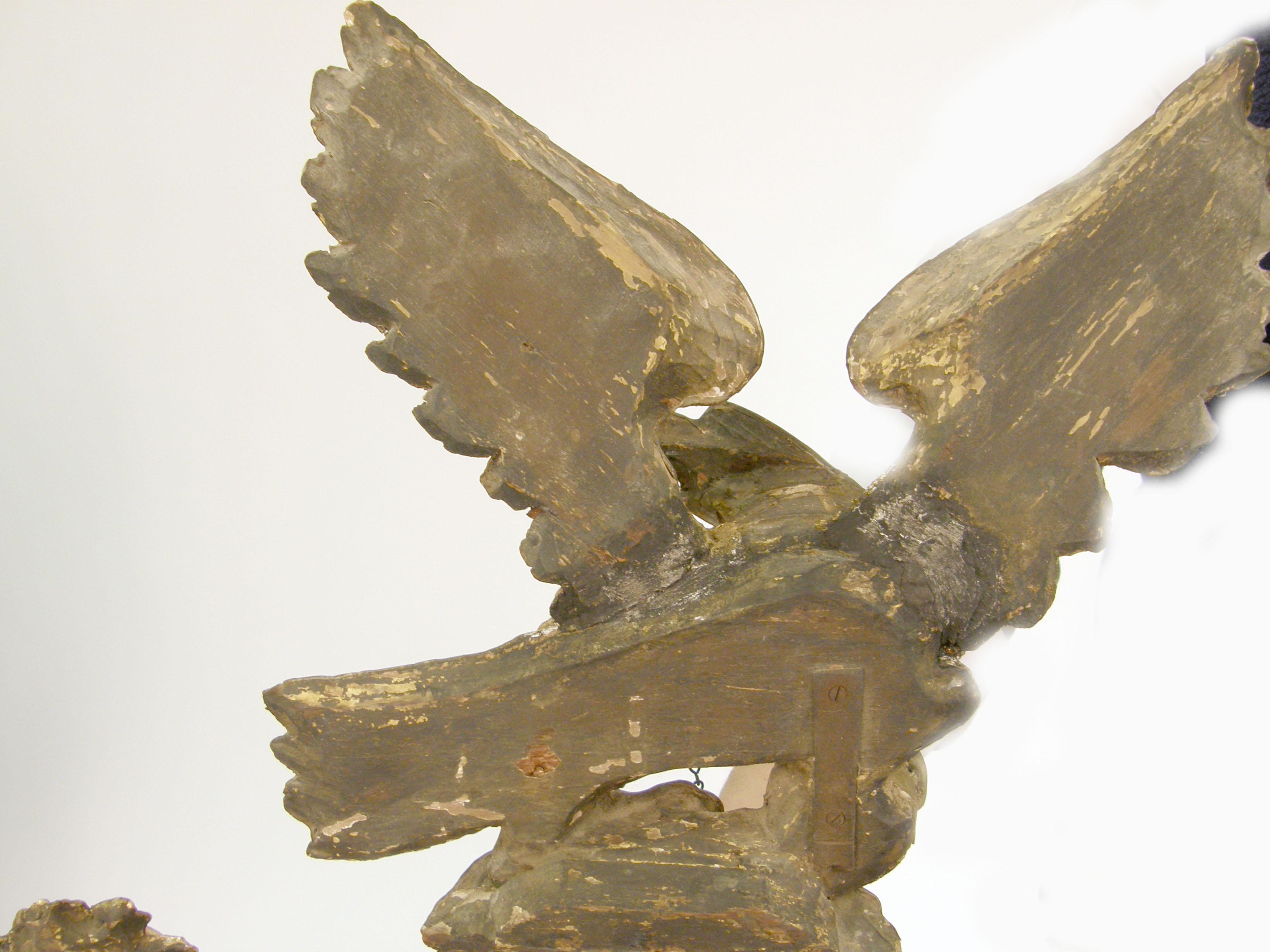 With an eagle-decorated finial and oak leaf carvings. 44"h x 27"w Repairs.